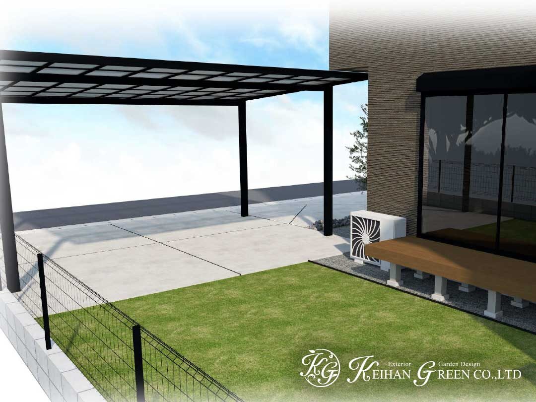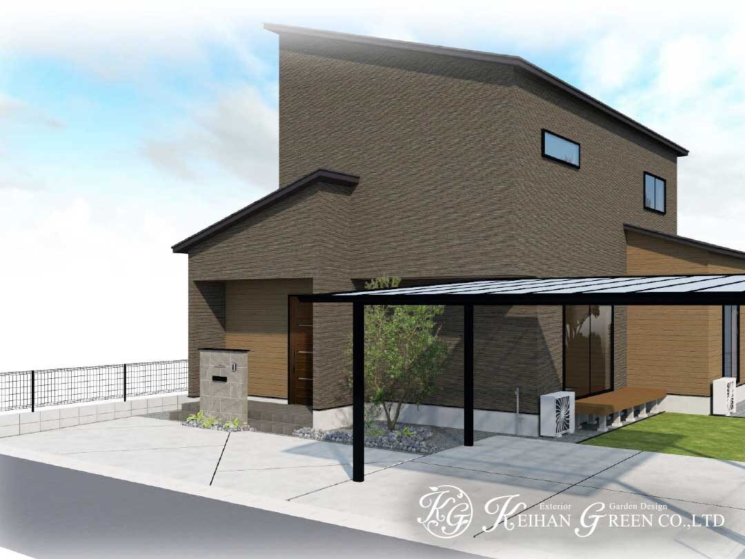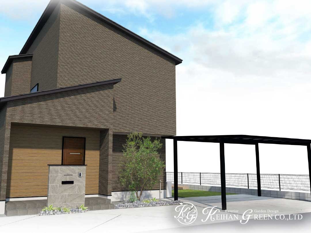 黒のフレームが映えるカーポートと、すっきりとした土間コンクリートで、建物の直線美を引き立てた新築外構プランです。