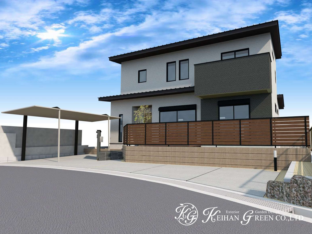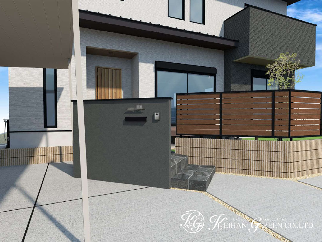 落ち着いた色合いの外観に、スタイリッシュなエクステリアが調和したモダンな外構デザイン。