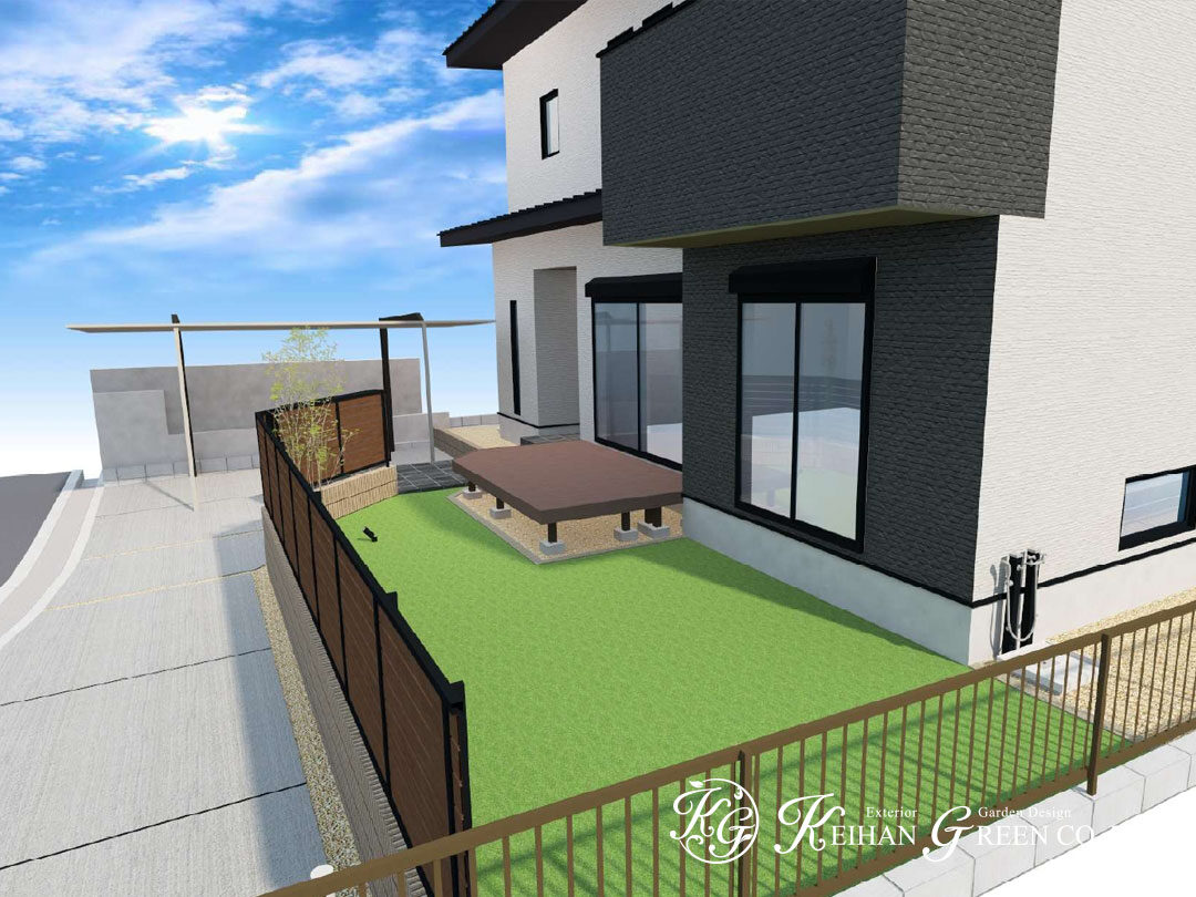 フェンス内側には人工芝を敷き、リビングからつながるウッドデッキで家族のくつろぎスペースを演出。