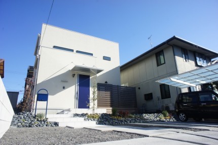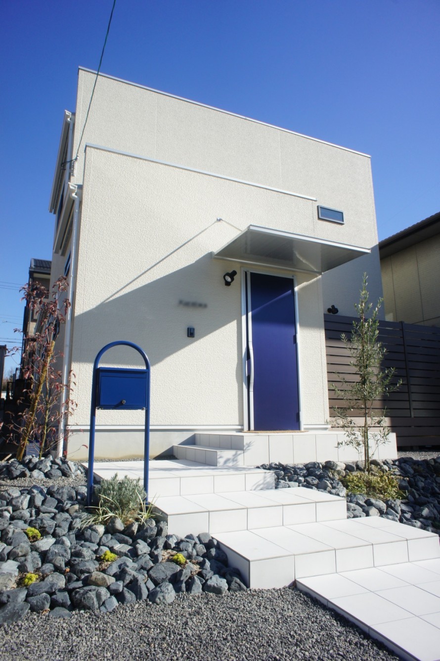 建物のブルーのドアに合わせたブルーのポストが印象的。 アプローチのタイルも白に統一して、スタイリッシュでスッキリとしています。 全面ののり面の部分に石積み風のデザインを取り入れ、シンプルな中にも個性を出しています。
