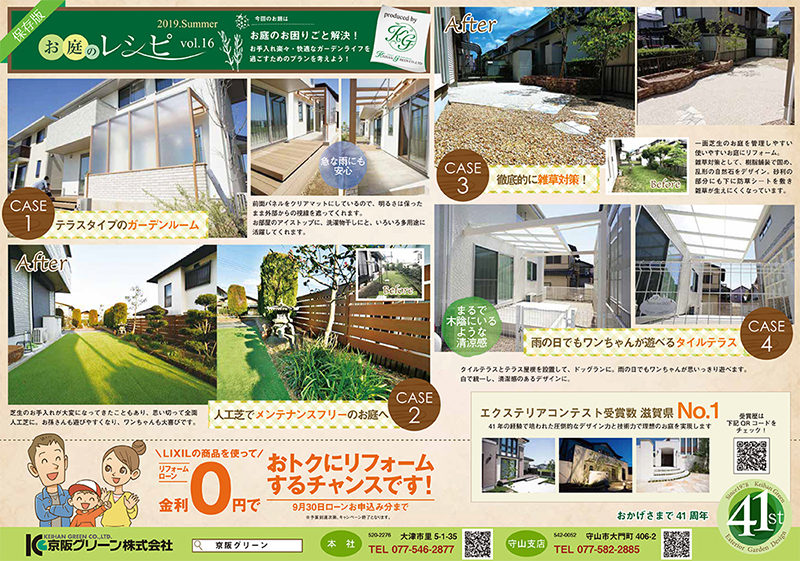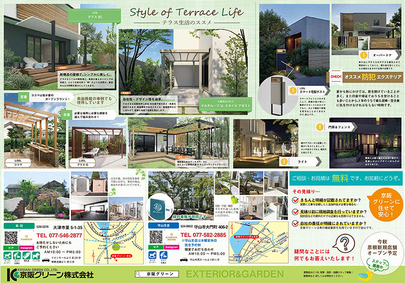 表面では、お庭のお困りごとを解決した事例を、裏面では、おすすめのテラス屋根と防犯面から見たエクステリアのご提案を掲載しています。
