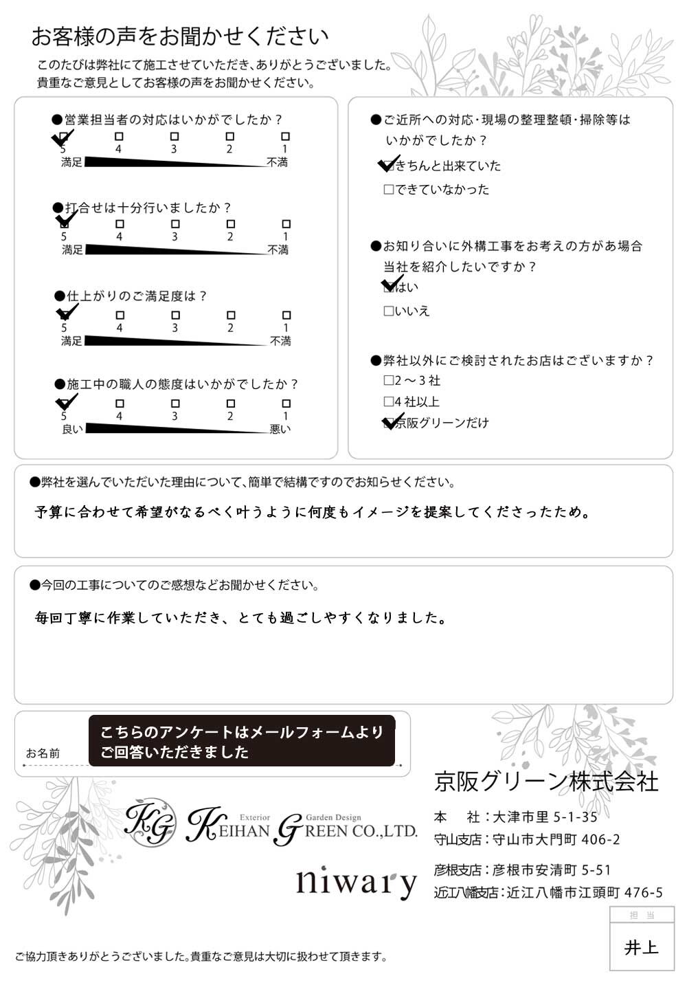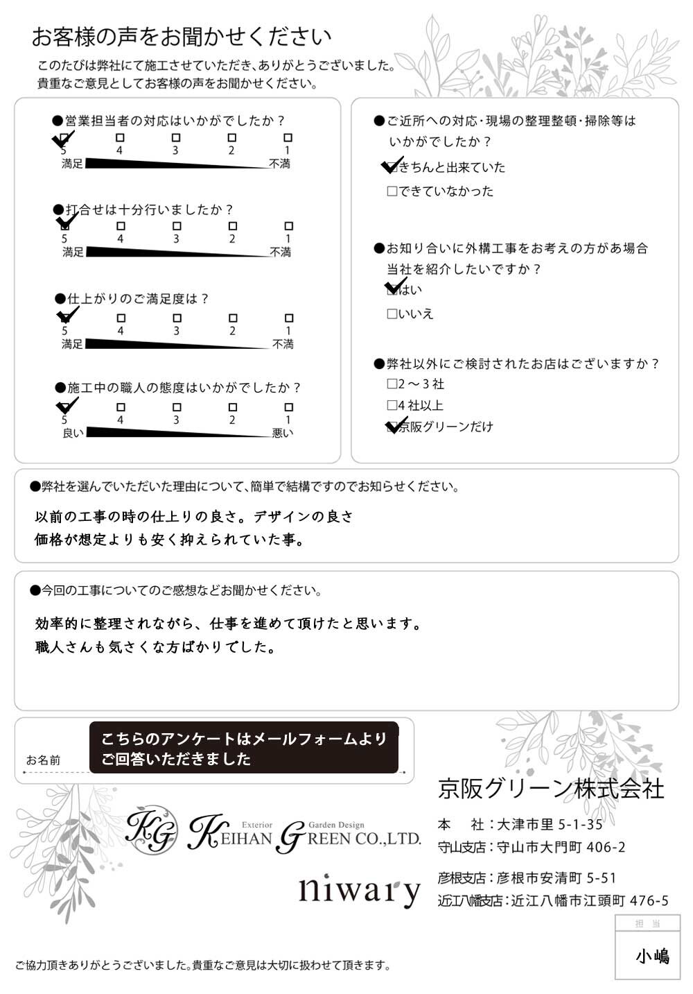今回、京阪グリーンさんにお願いして本当に良かったと思ってます。ありがとうございました。