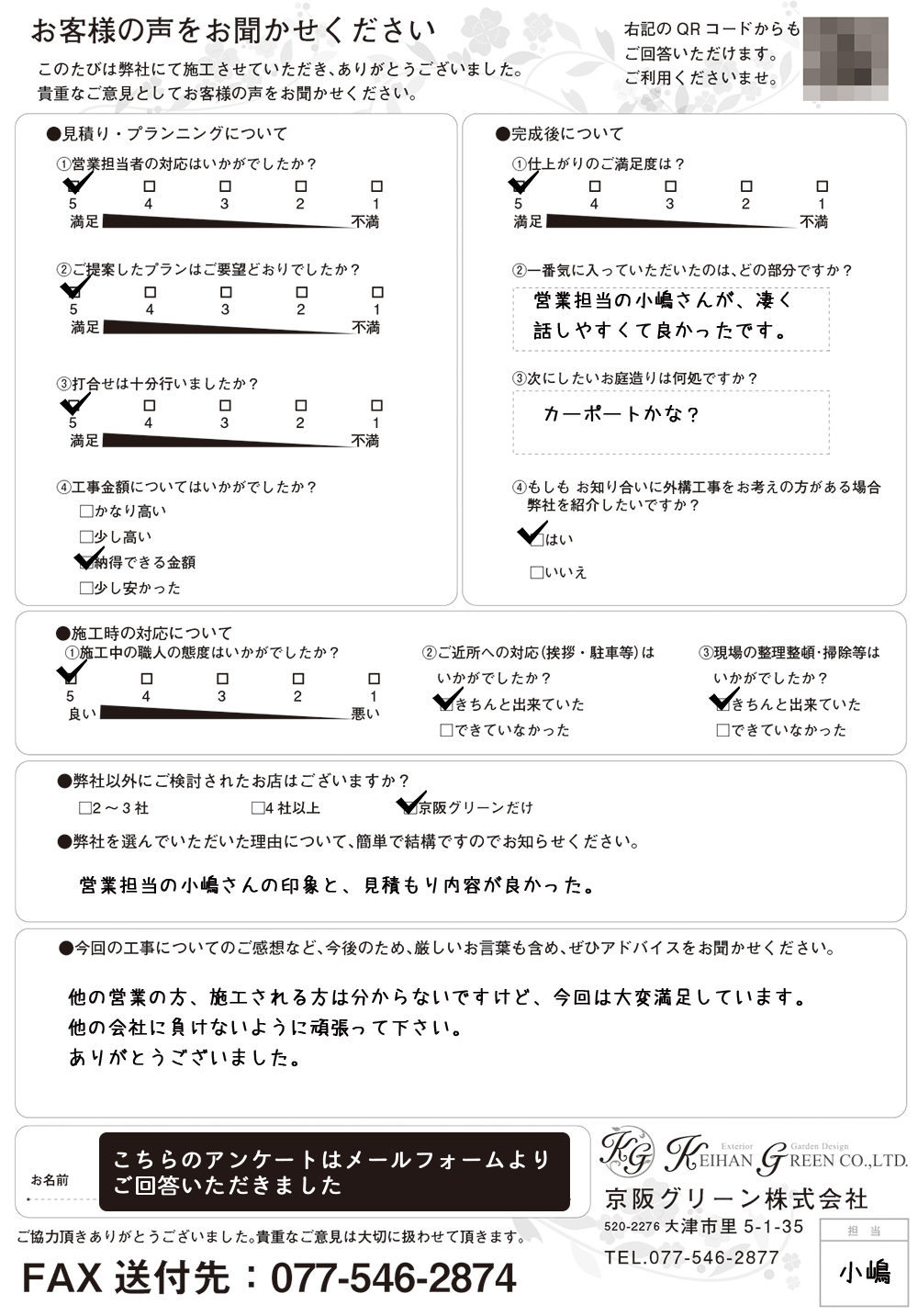 他の営業の方、施工される方は分からないですけど、今回は大変満足しています。
