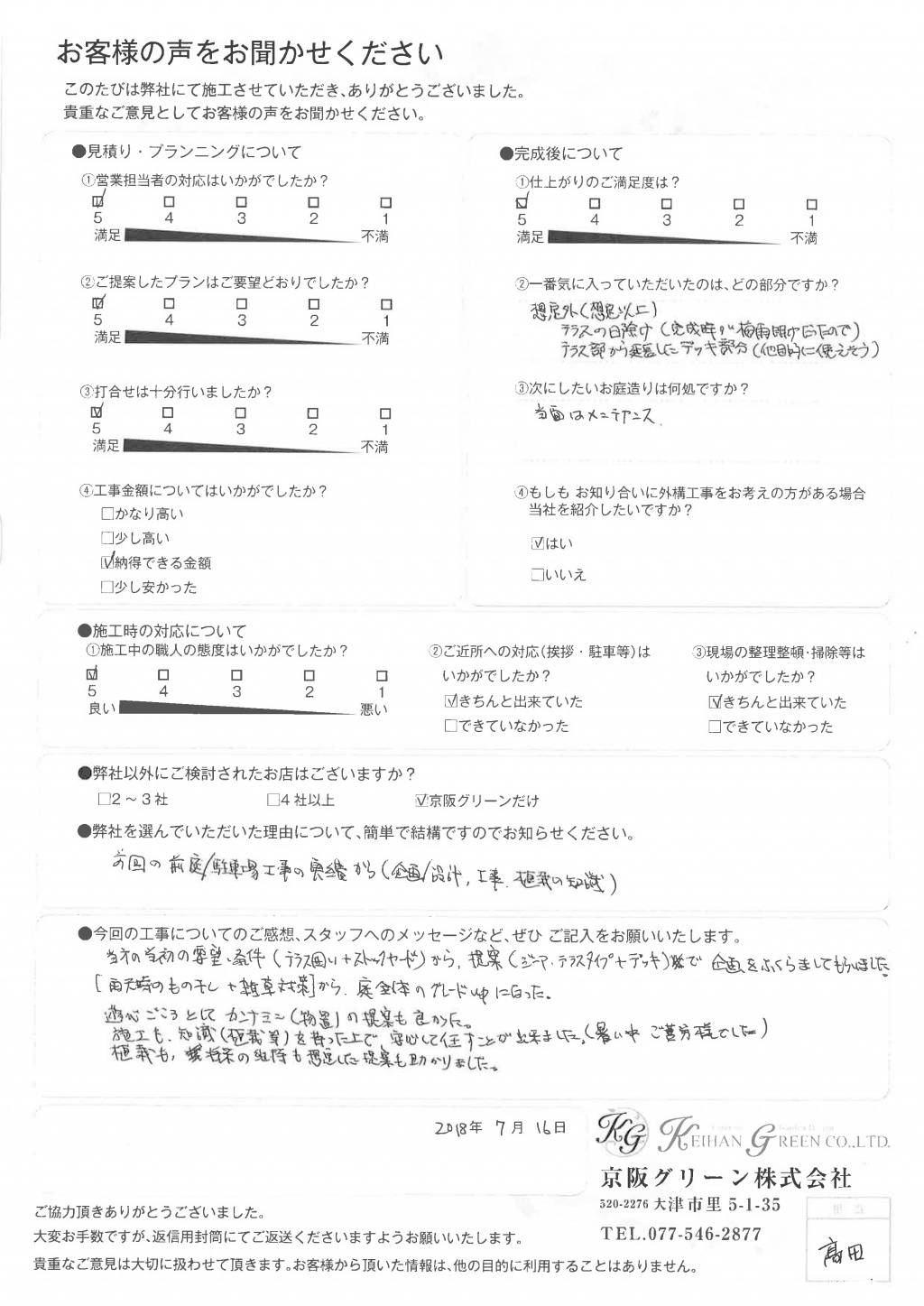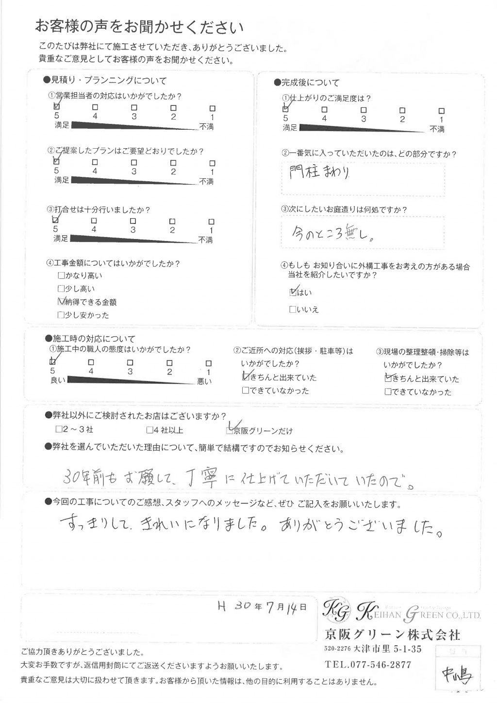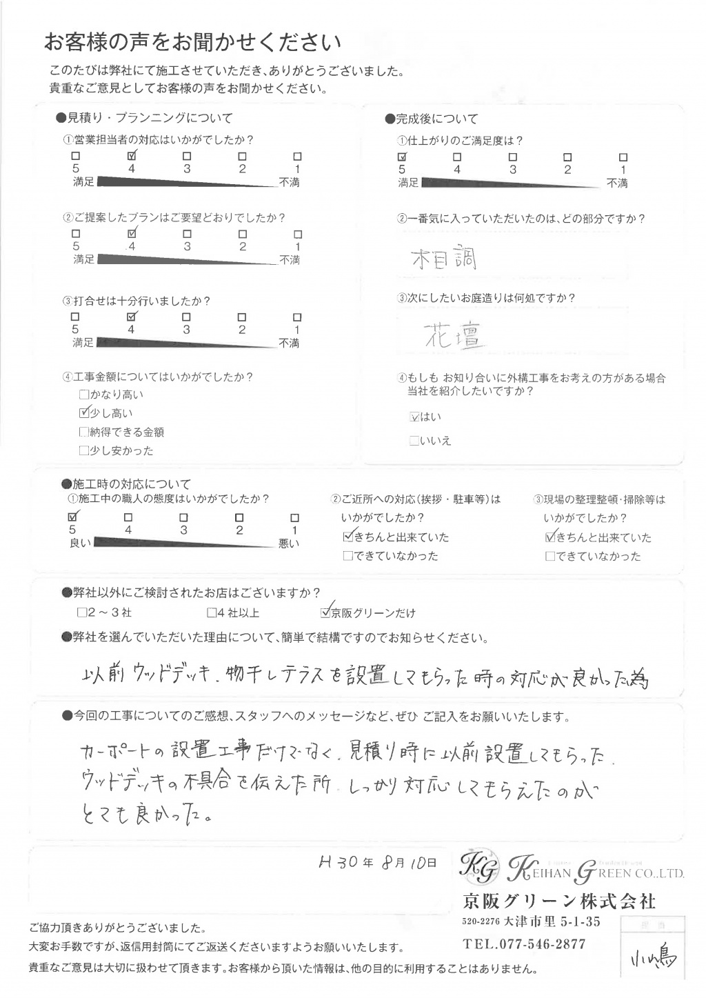 施工も、知識(植栽等)を持った上で、安心して任すことが出来ました。(暑い中 ご苦労様でした)