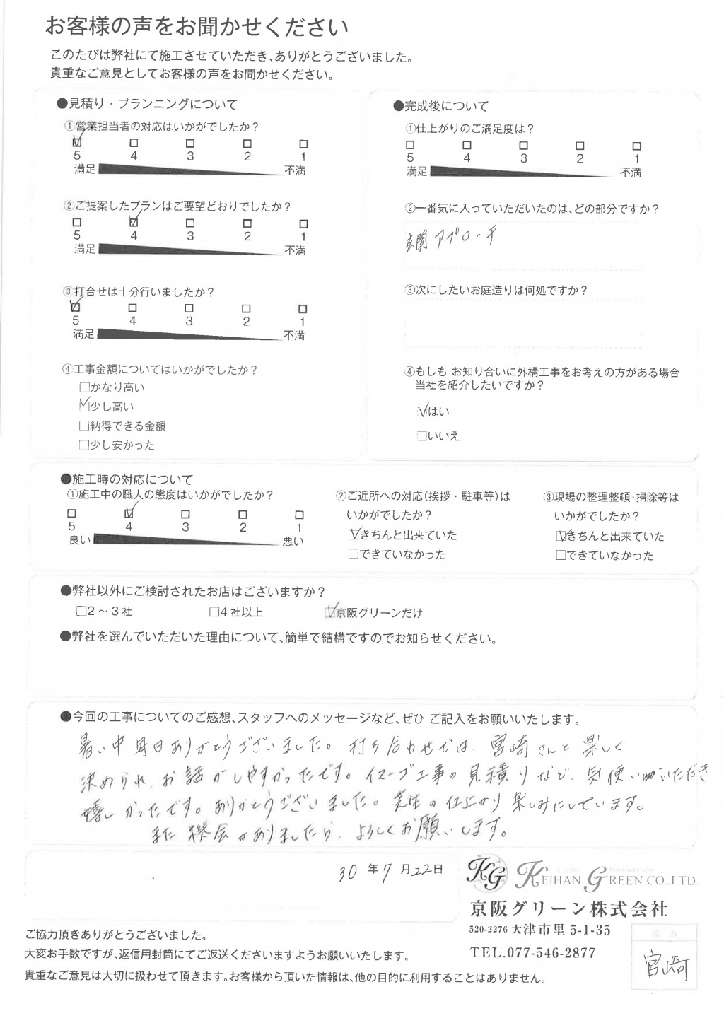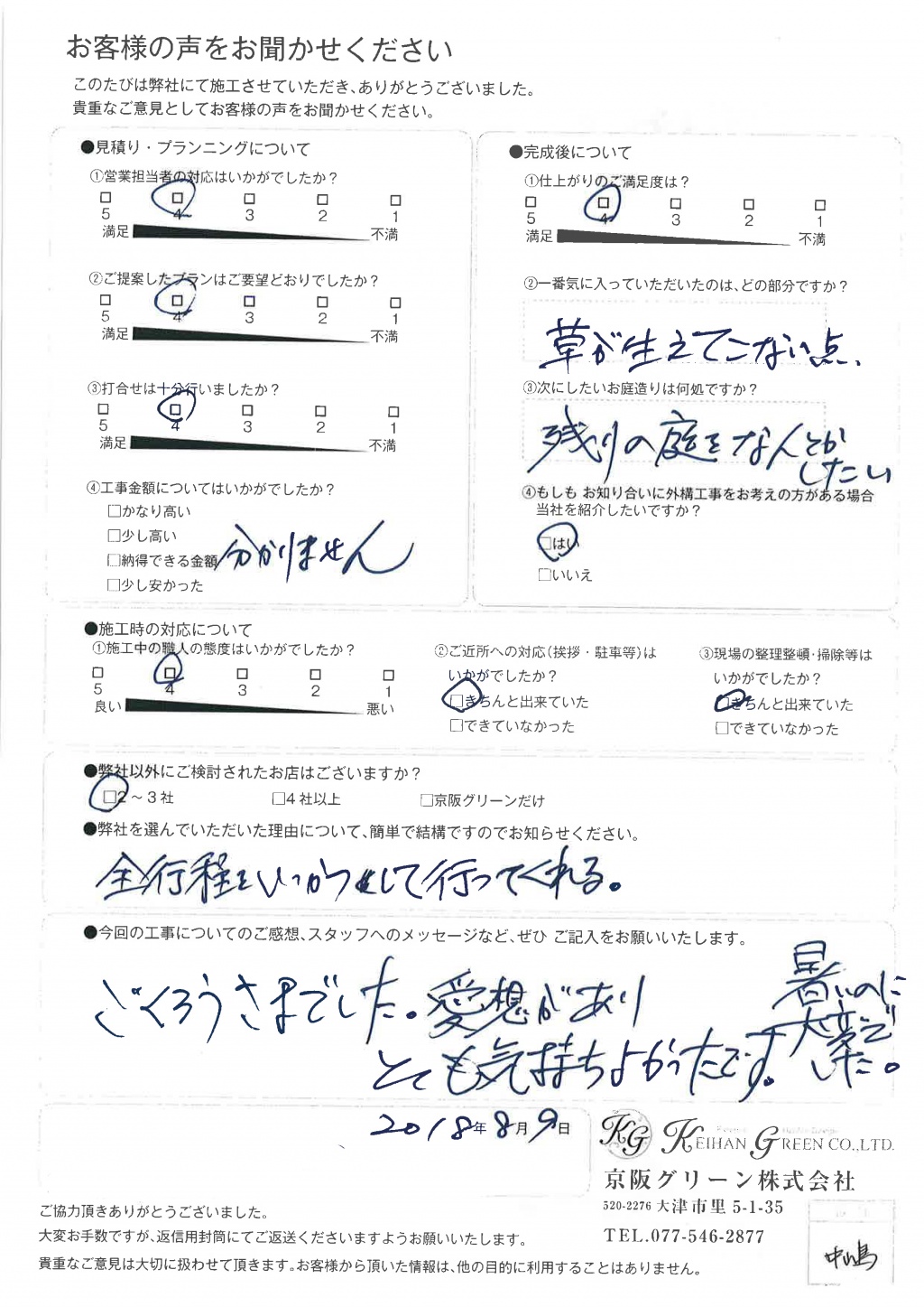 暑い中 毎日ありがとうございました。打ち合わせでは、宮崎さんと楽しく決められ、お話がしやすかったです。イマーゴ工事の見積りなど、気づかいいただき嬉しかったです。ありがとうございました。芝生の仕上り楽しみにしています。
