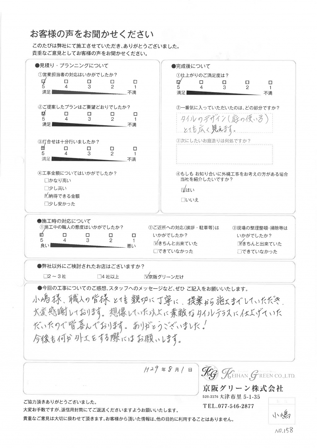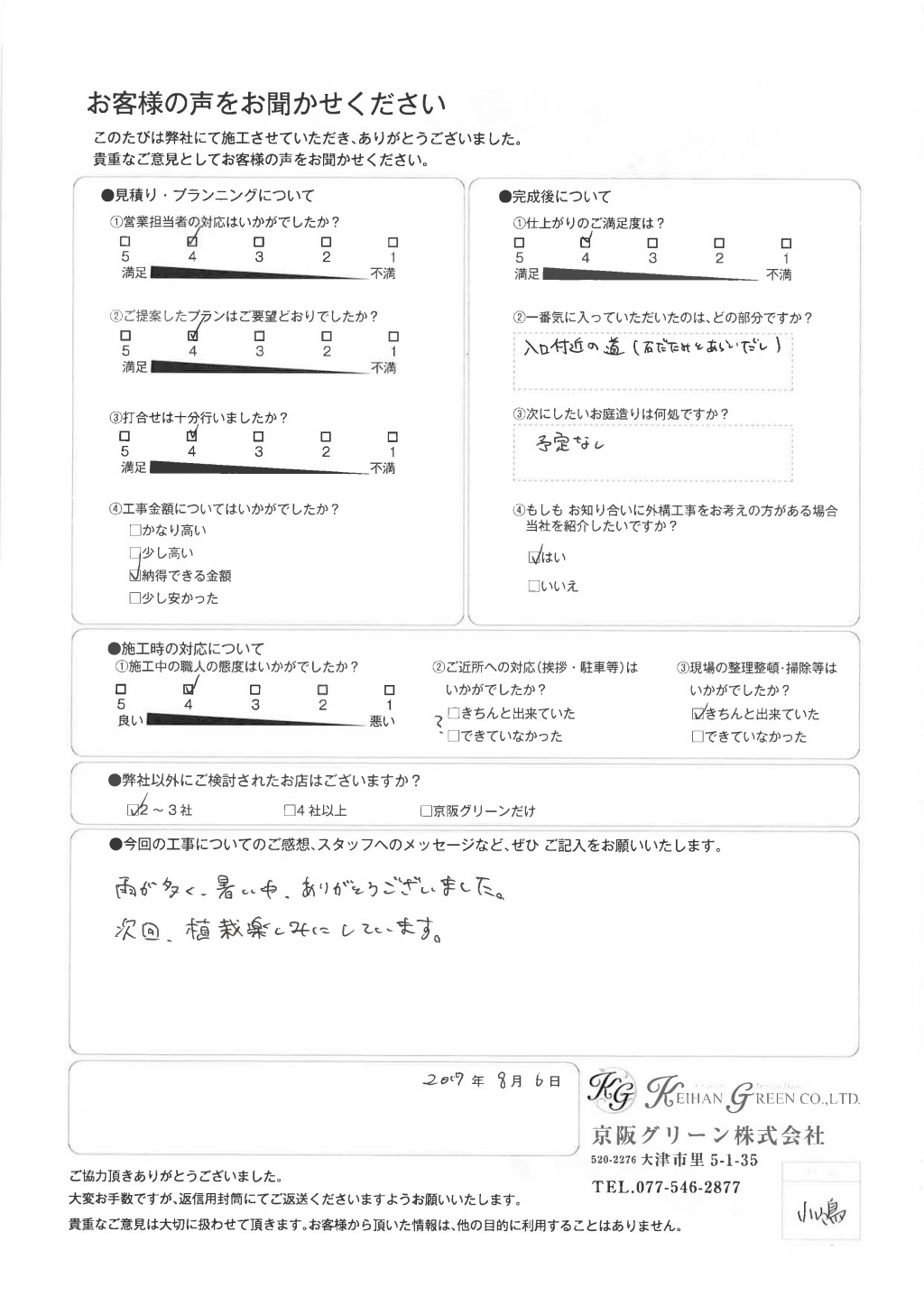 暑い中、ありがとうございました。完成にはとても満足しております。