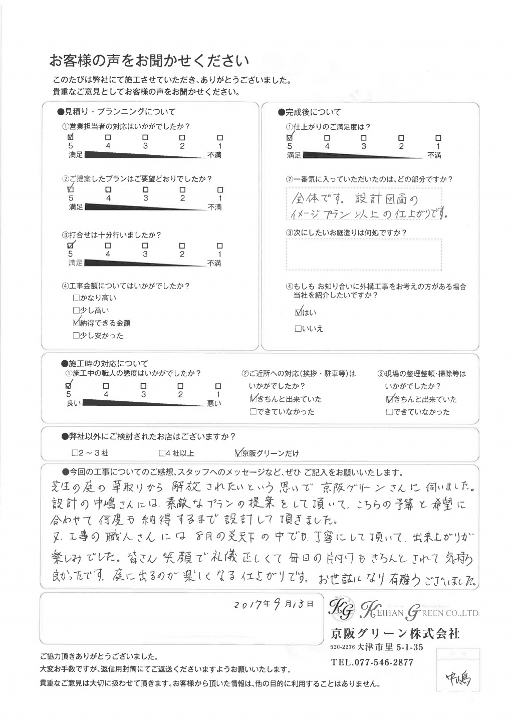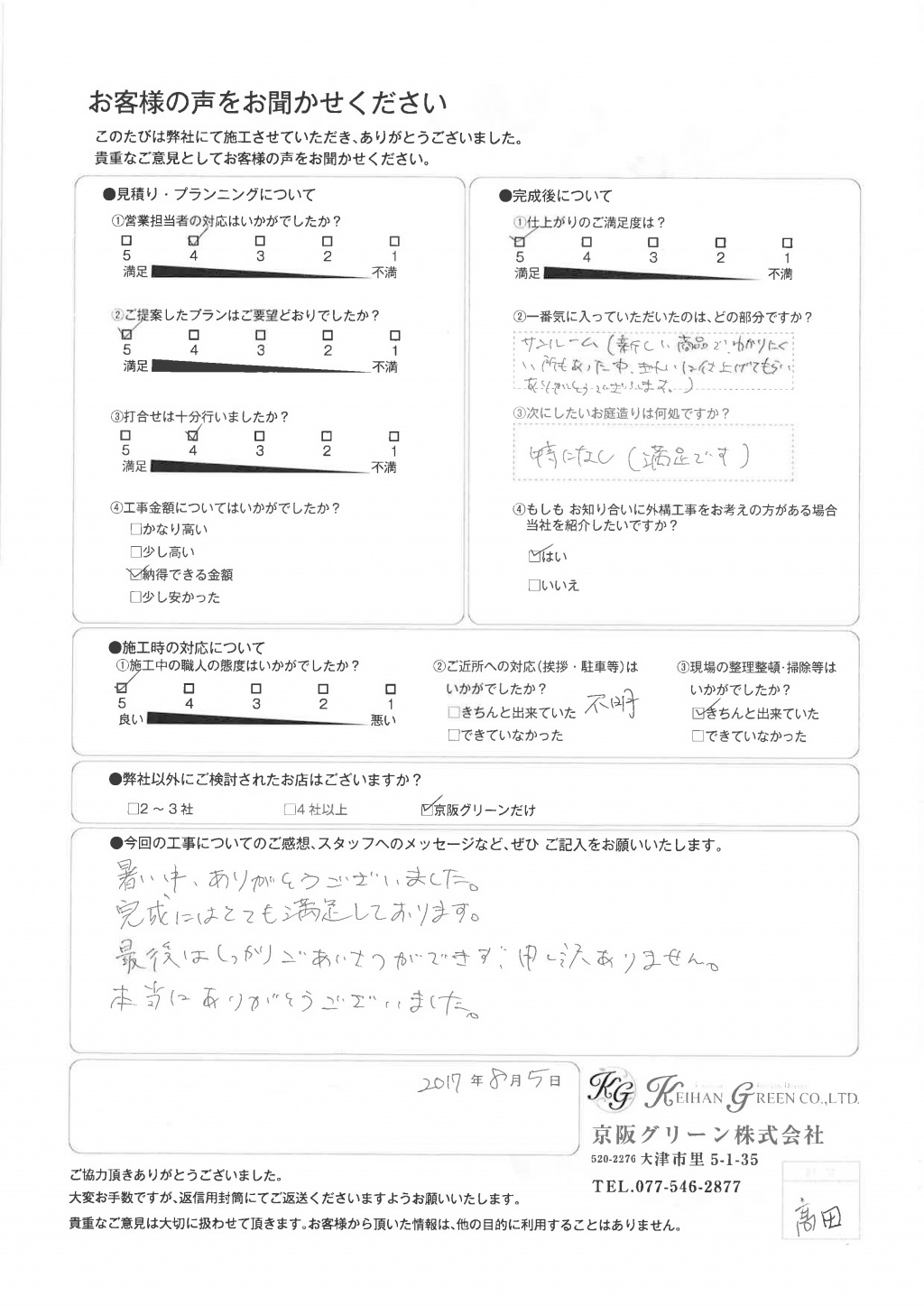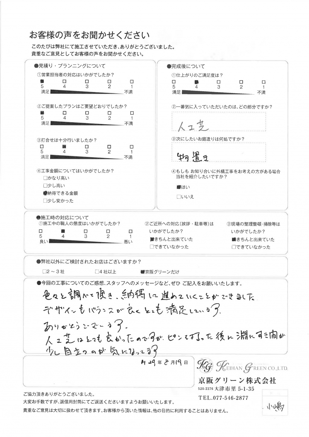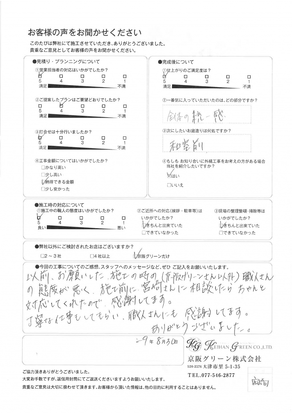 以前、お願いした施工の時の(京阪グリーンさん以外)職人さんの態度が悪く、施工前に宮崎さんに相談したらちゃんと対応してくれたので、感謝してます。