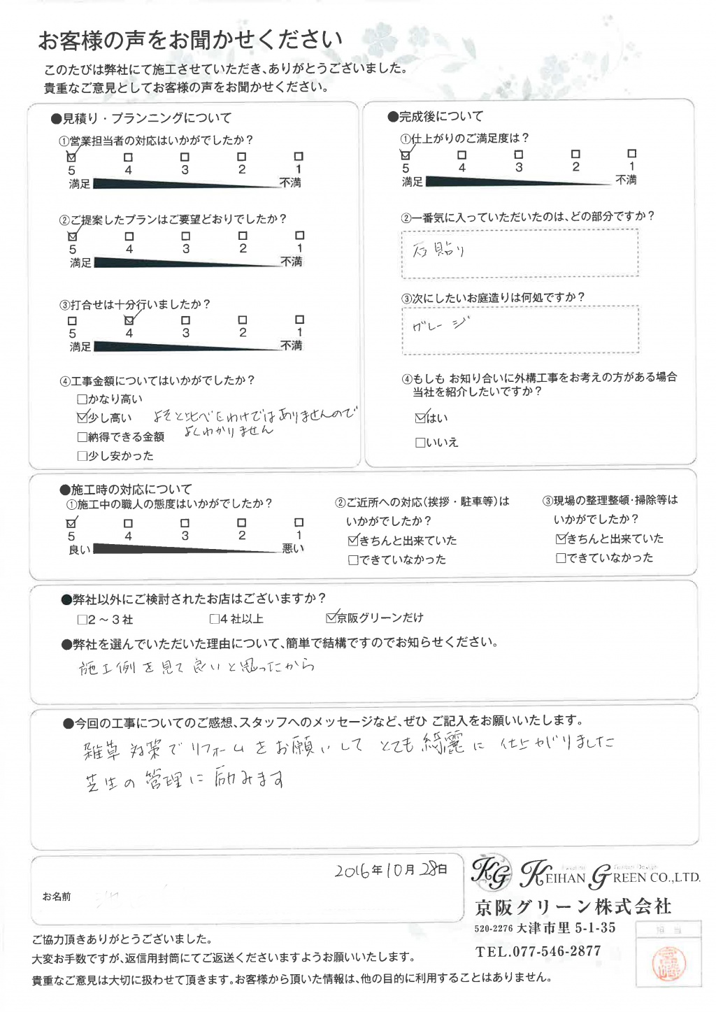全くわからないことばかりでしたが、はじめてお店に入ってからワクワクしてました。いくつもプランを出してもらい、あんなことも、こんなことも出来るんやーと、うれしくなりました。なので出来上がった姿に大満足です。工事中も難しそうな作業やなーと思いながらみてましたが、職人さんってスゴイですね。
