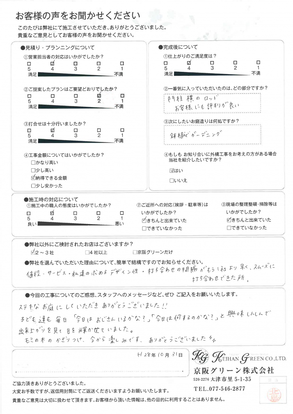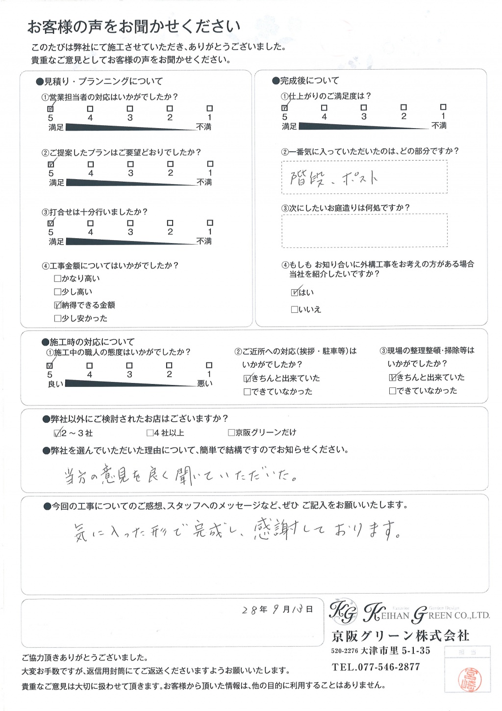 雑草対策でリフォームをお願いして、とても綺麗に仕上がりました。芝生の管理に励みます。