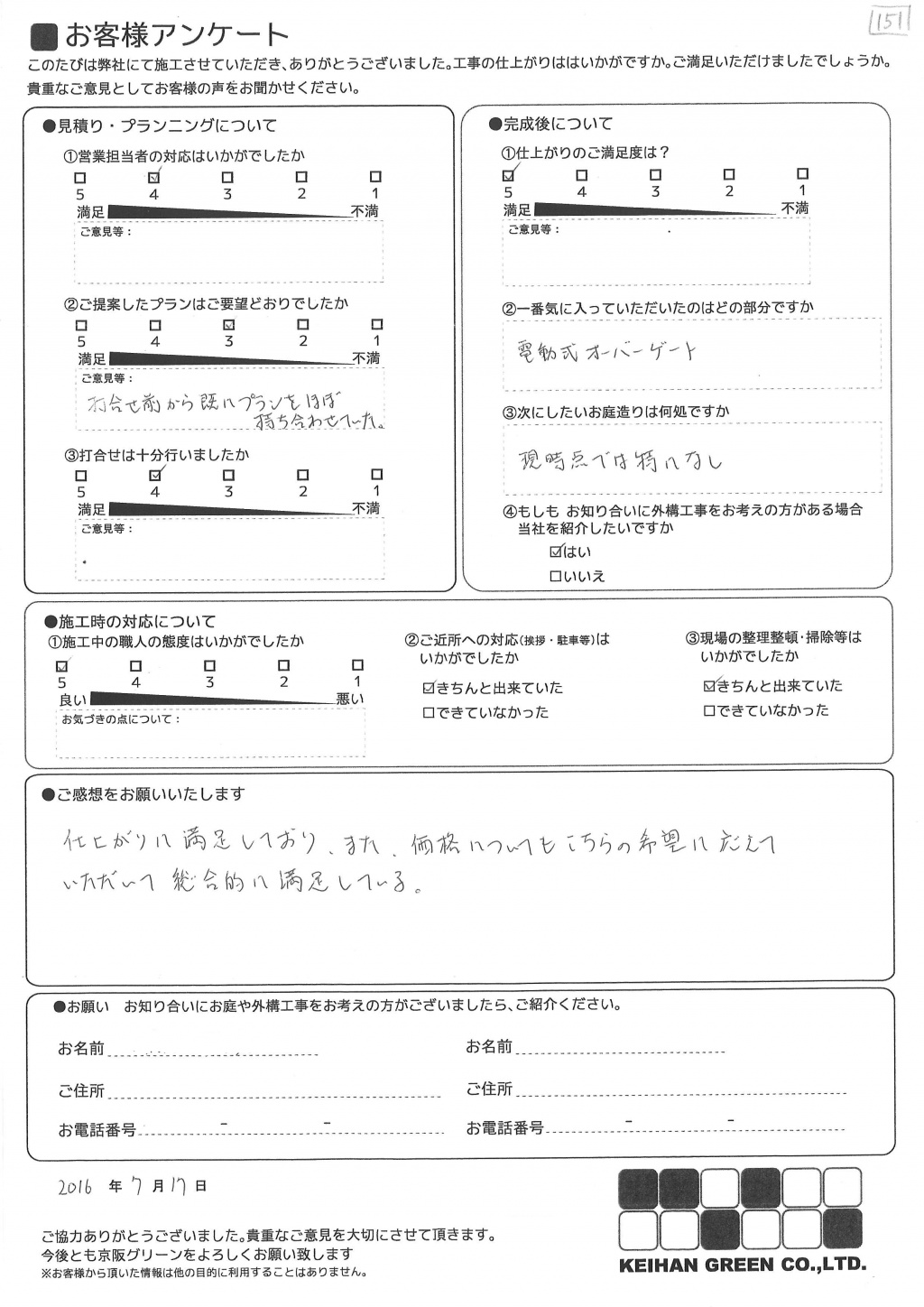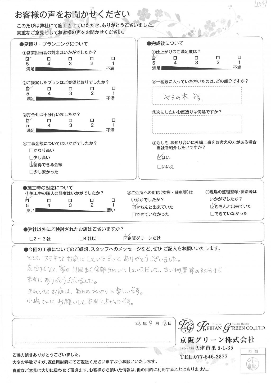 仕上りに満足しており、また 価格についてもこちらの希望に応えていただいて総合的に満足している。