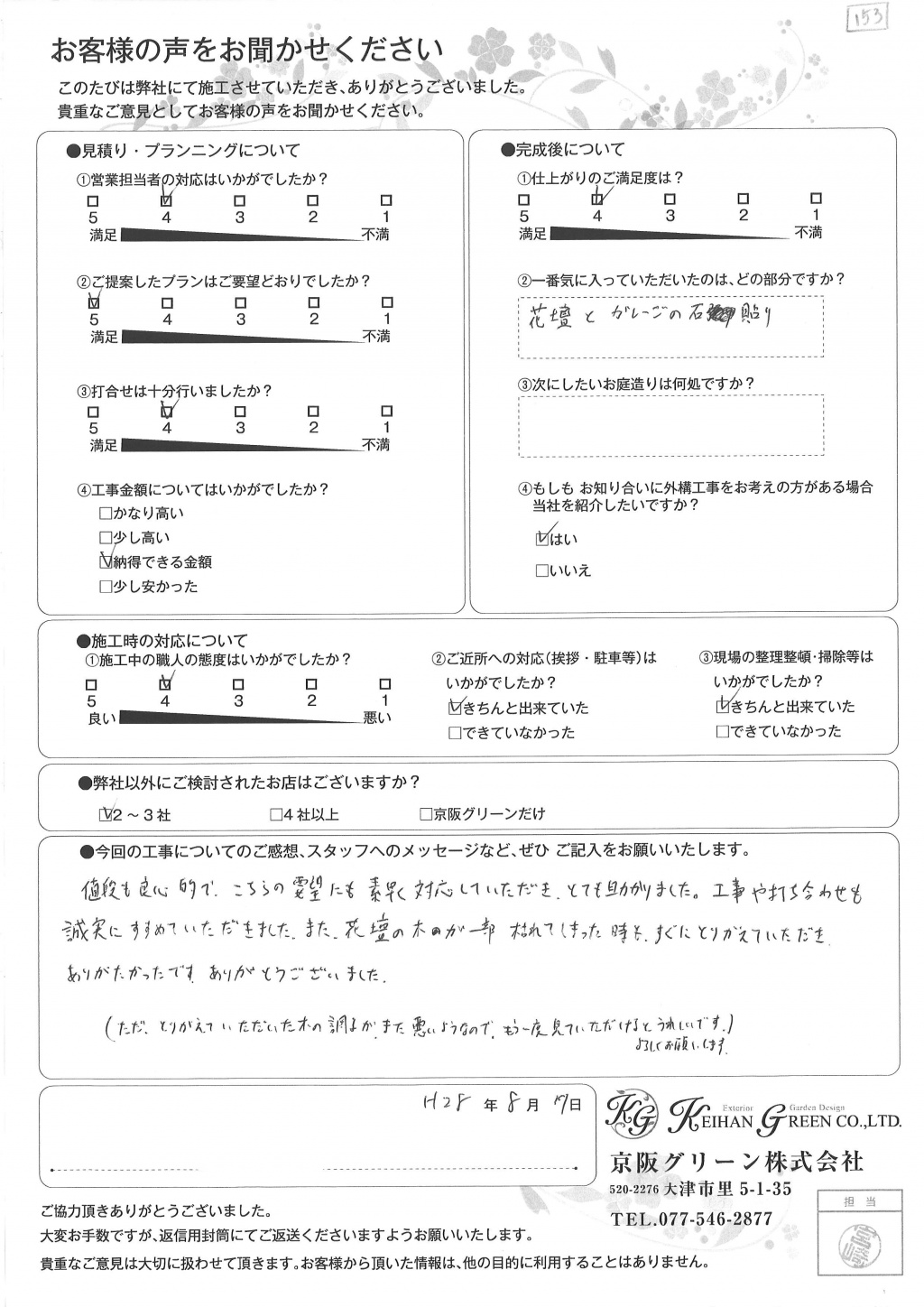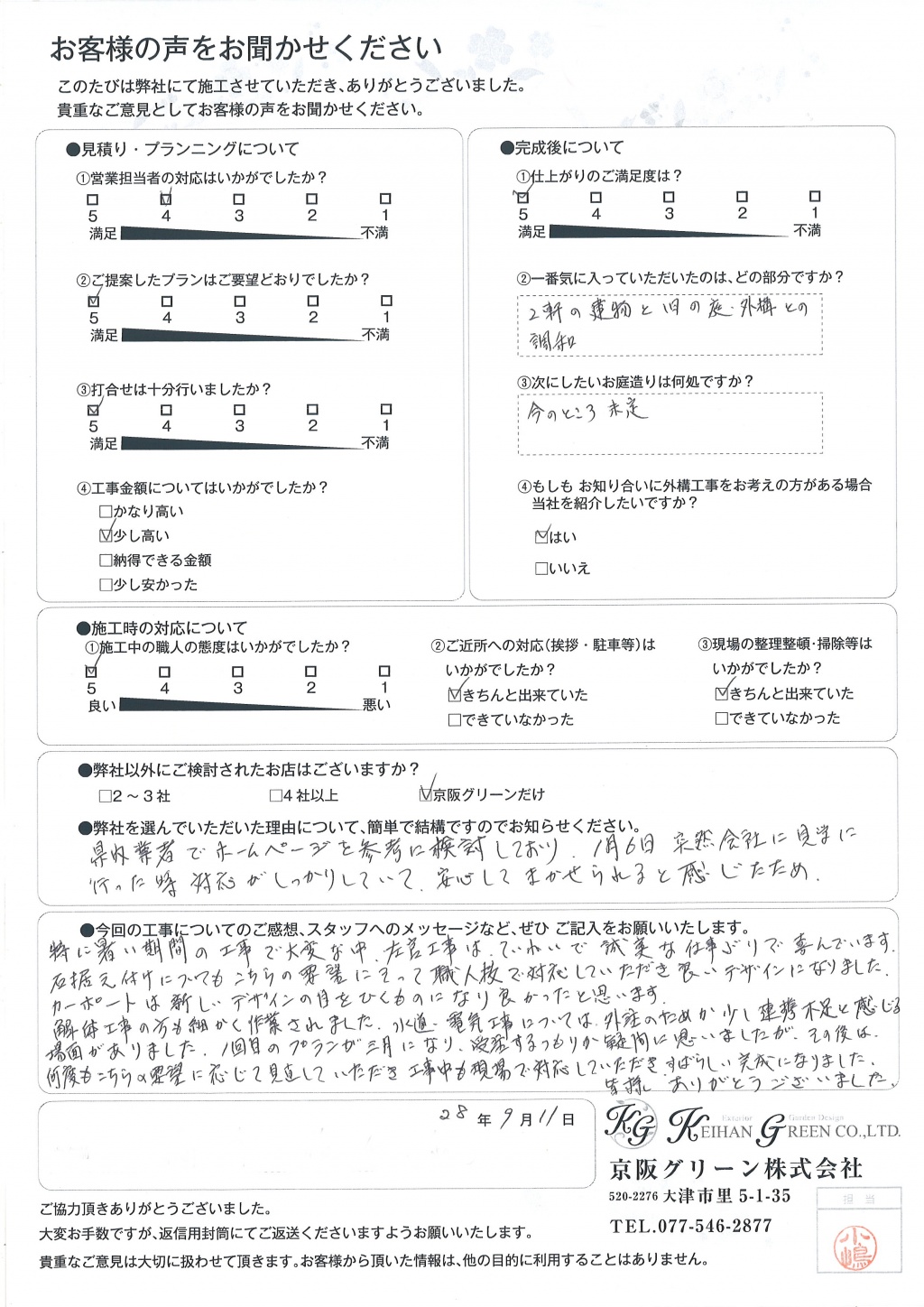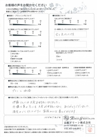 庭だけでなく家の周囲まで全部きれいにしていただいて、古い物置等の処分まで本当にありがとうございました。