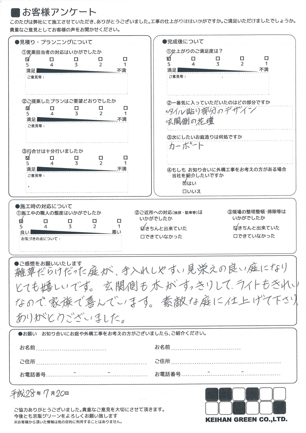 雑草だらけだった庭が、手入れしやすい見栄えの良い庭になりとても嬉しいです。玄関側も木がすっきりして、ライトもきれいなので、家族で喜んでいます。素敵な庭に仕上げて下さり、ありがとうございました。