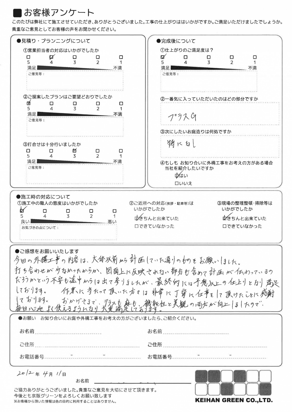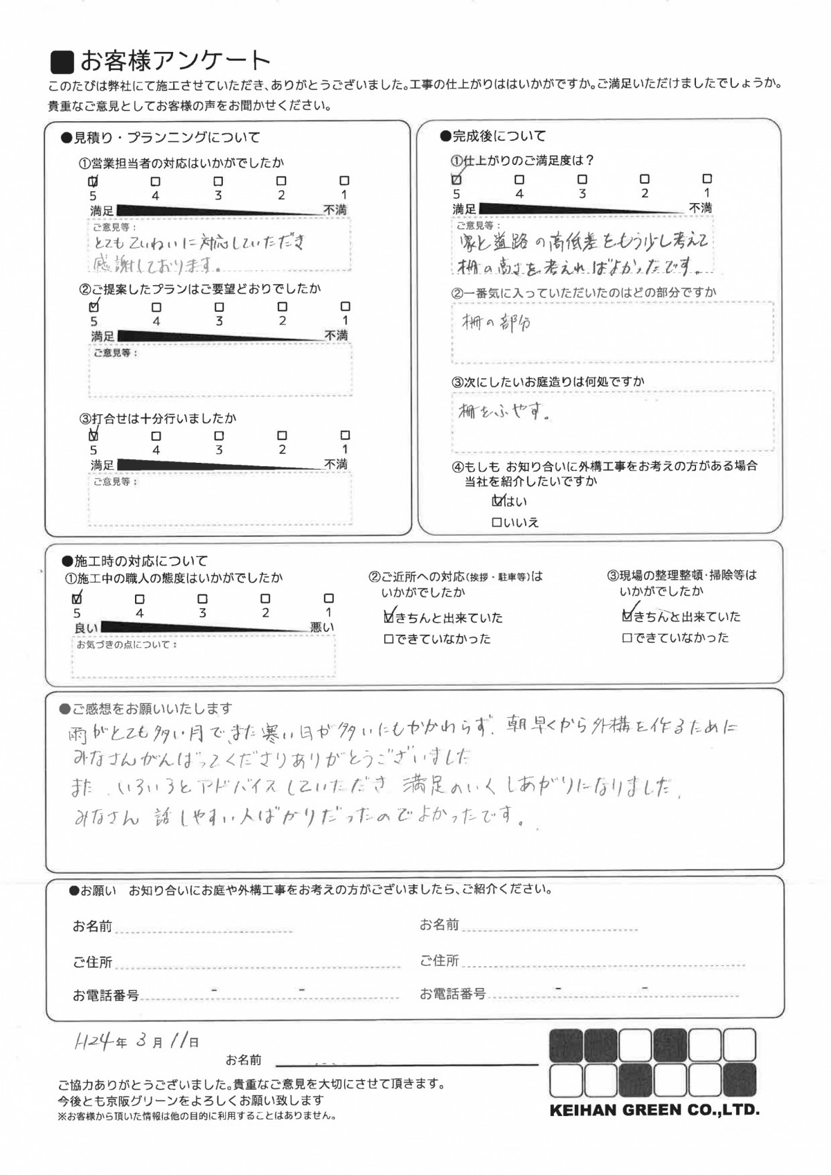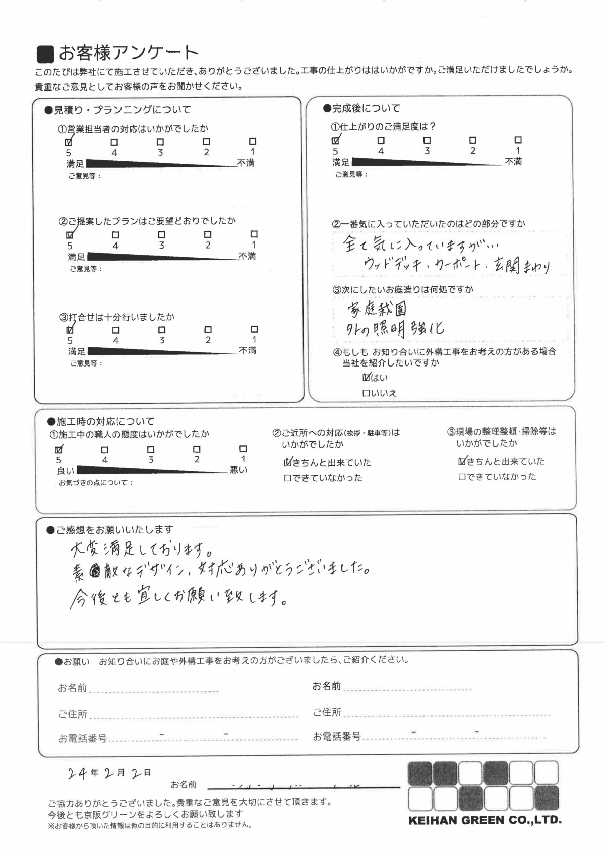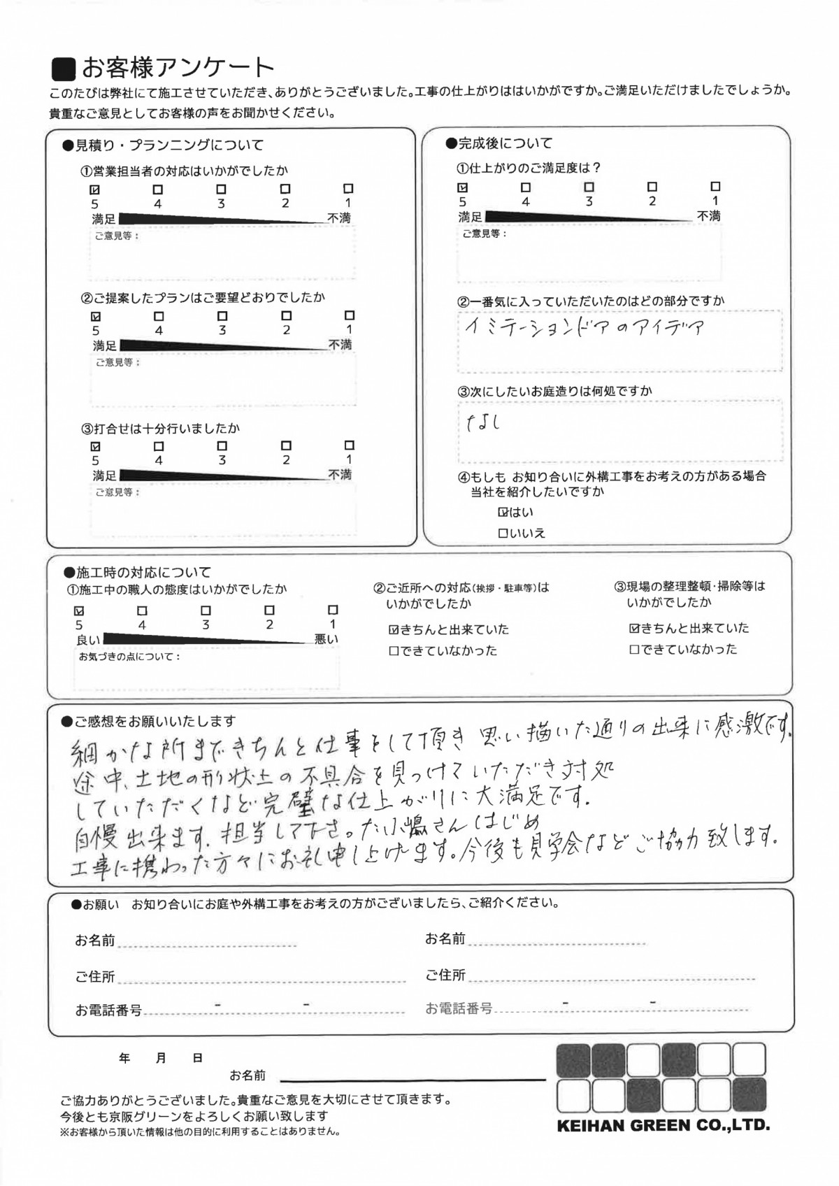 細かな所まできちんと仕事をして頂き、思い描いた通りの出来に感激です。途中、土地の形状上の不具合を見つけていただき対処していていただくなど完璧な仕上がりに大満足です。自慢できます。