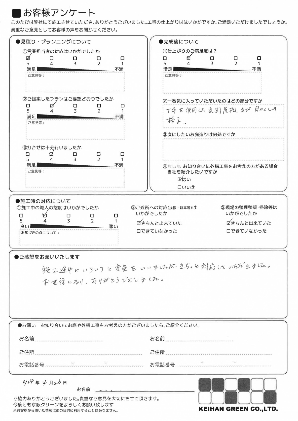 施工途中にいろいろと変更をいいましたが、きちっと対応していただきました。