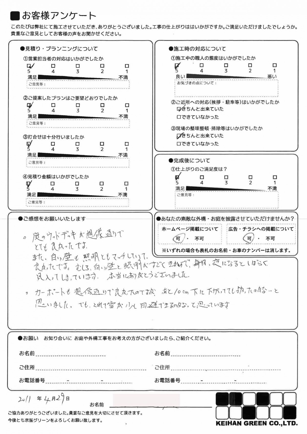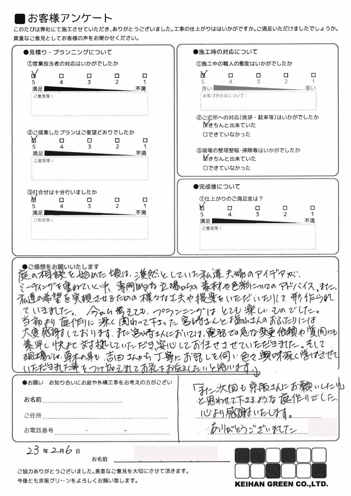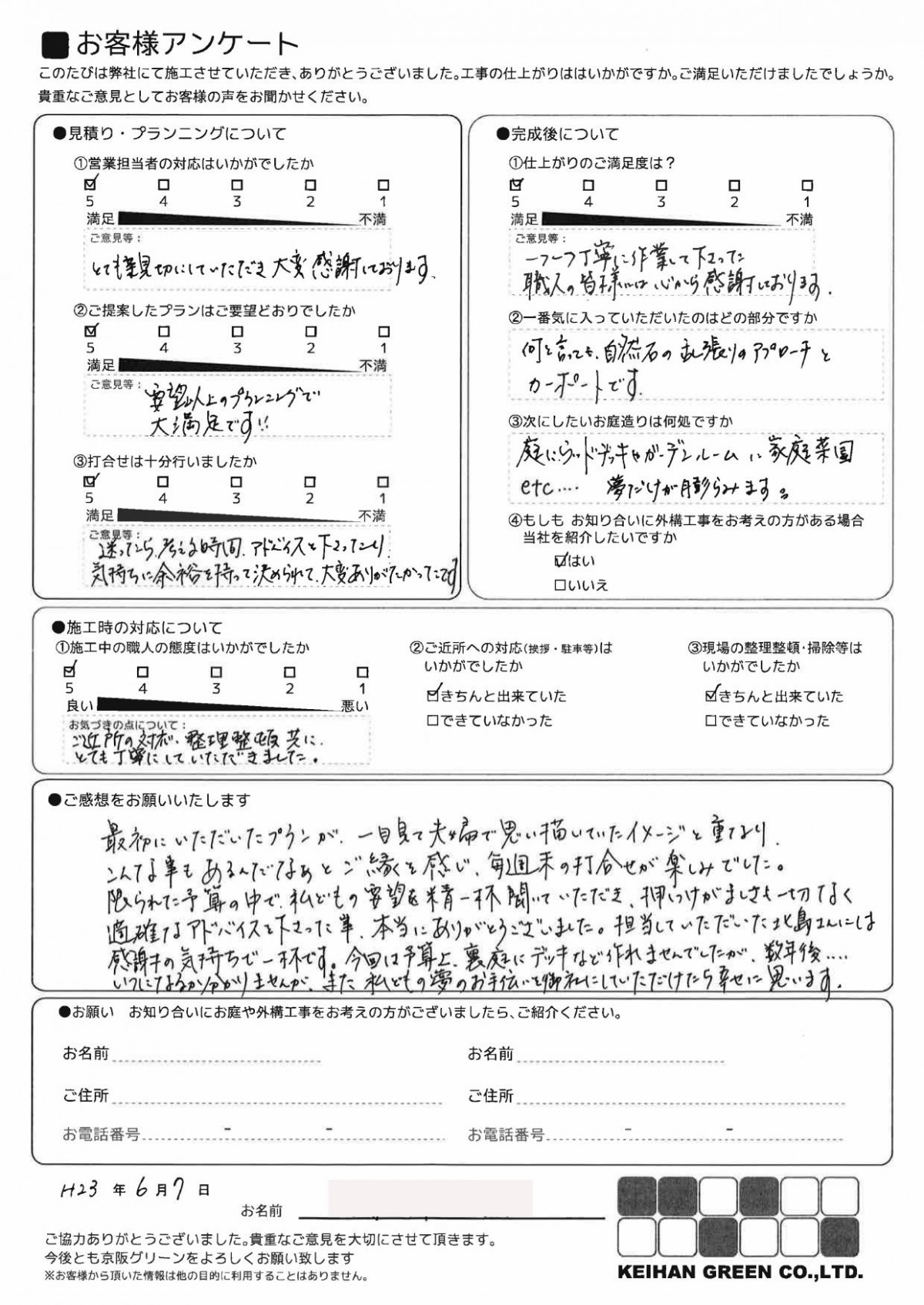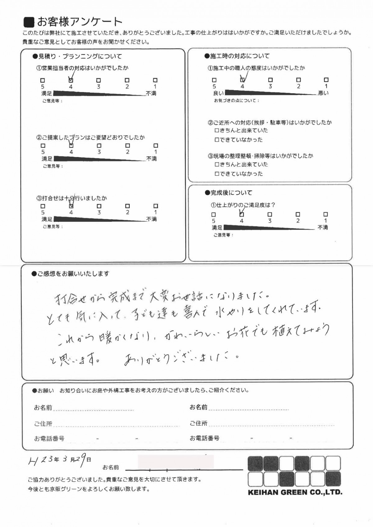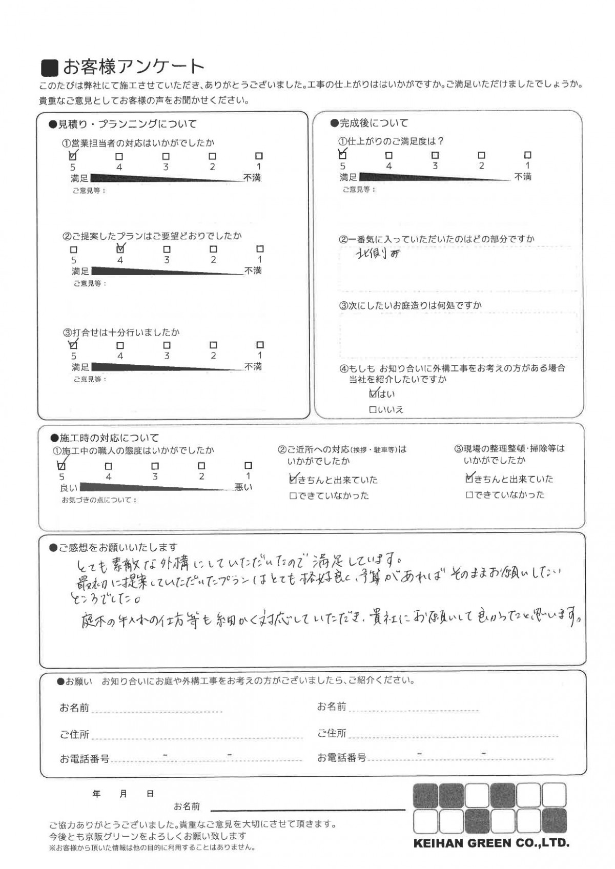 庭については、想像していたものよりよい出来あがりで、満足しております。