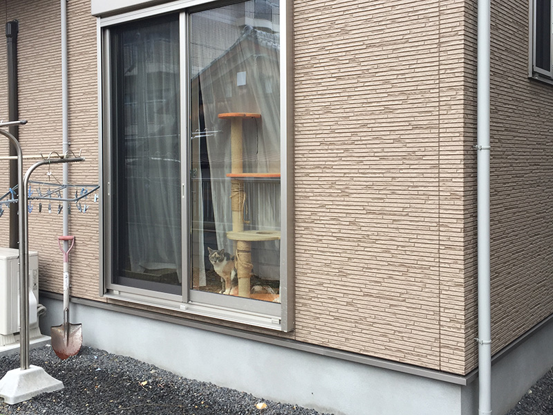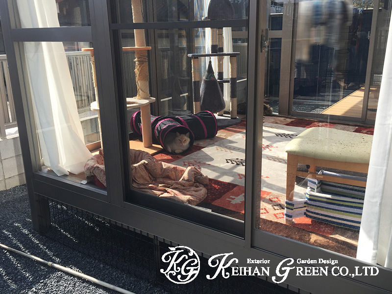 4匹の猫ちゃんのためにサンルームを設置。キャットタワーやおもちゃやベッドなど猫ちゃんには楽園のようなスペースです。床はフローリング仕様、オールシーズン快適に過ごせるように内部日除けや網戸などを取り付けています。 手つかずだった外構も、アプローチや門柱をデザイン、2台用のカーポートを設置し、ずいぶんと雰囲気が変わり使いやすくなりました。
