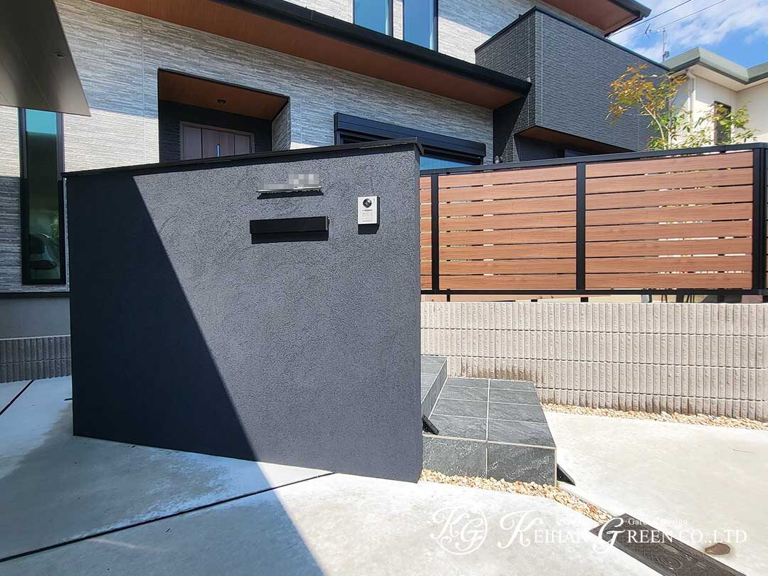 門柱は濃いグレーの塗り壁仕上げ。