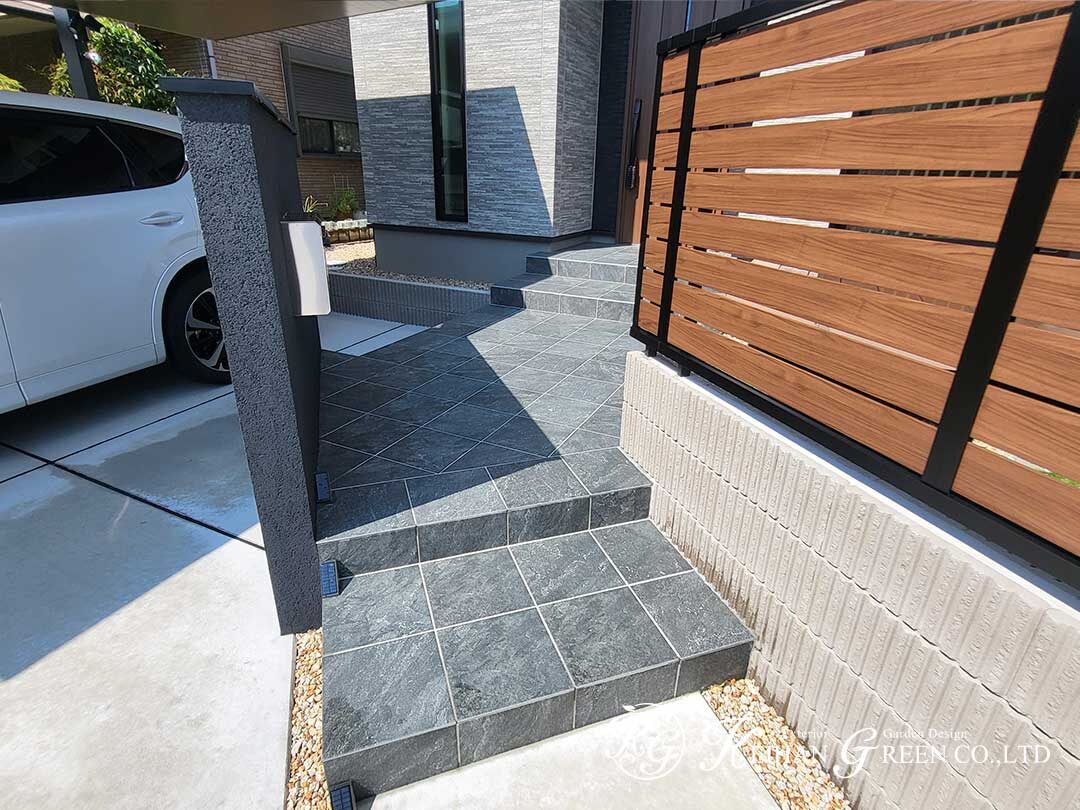 アプローチにはグレー系のタイルを採用し、門柱との一体感を持たせつつ落ち着いた印象に。