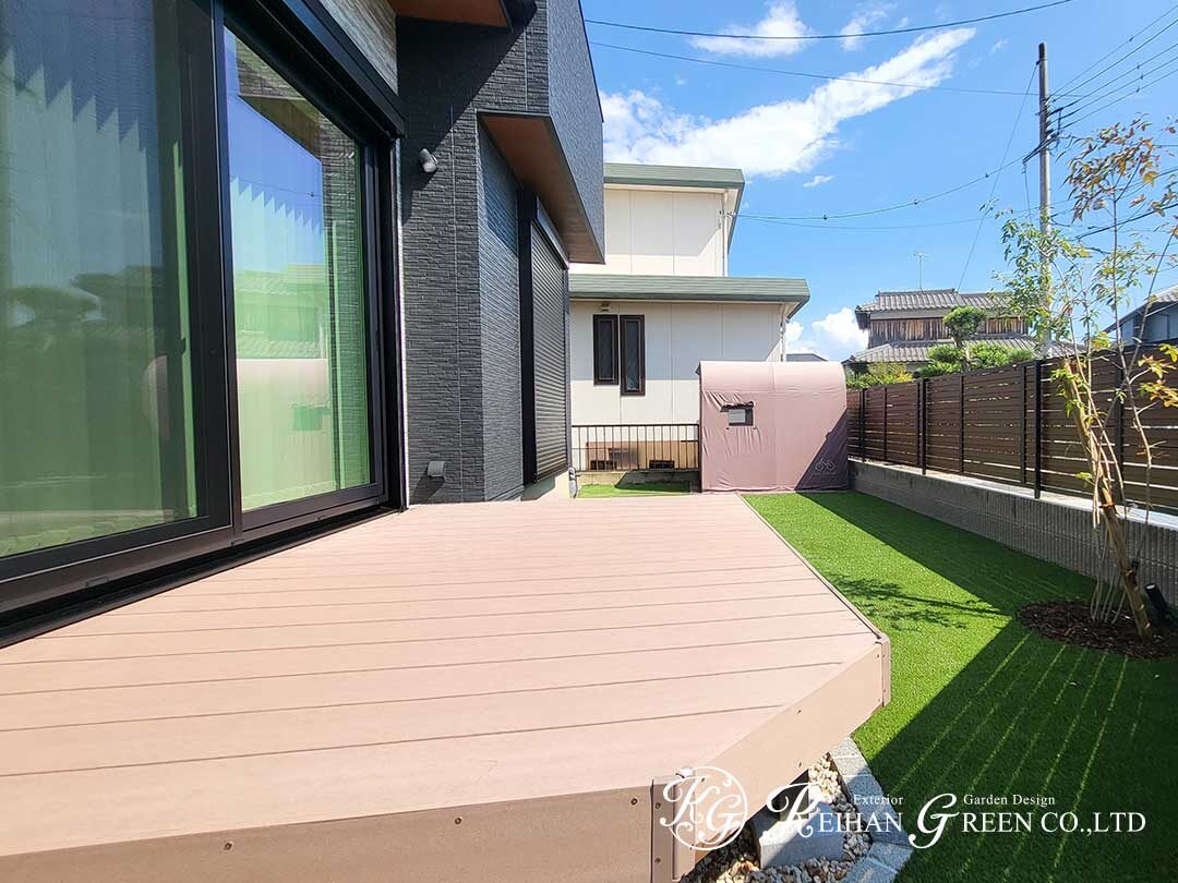庭には人工芝とウッドデッキを設け、掃き出し窓からフラットにつながる動線で、室内と屋外が一体となった快適な空間に仕上げました。