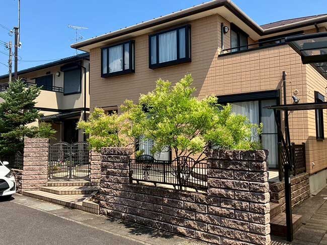 控えめな石目調が外壁色になじみ、清潔感のある表情をキープ。