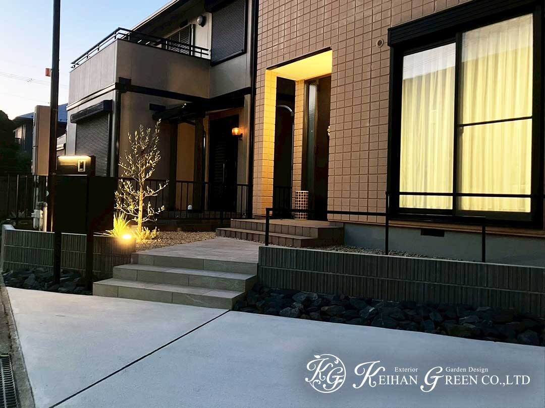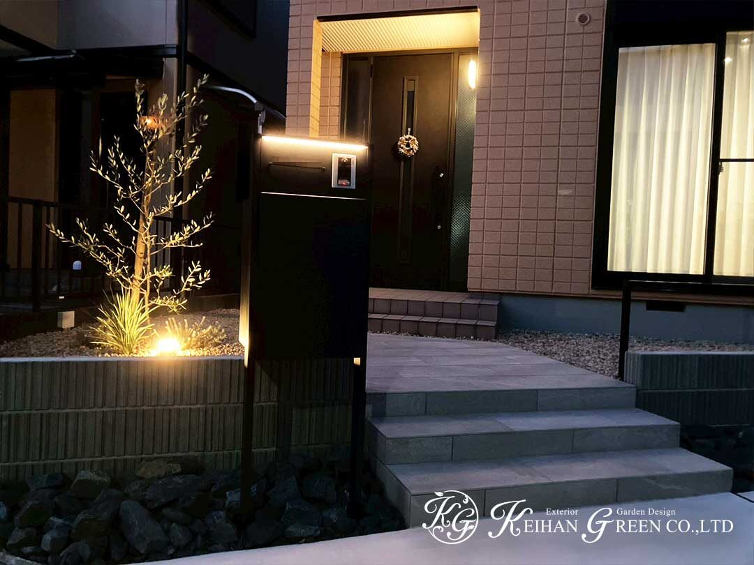 低層の植栽をやさしく照らすライトを組み合わせ、帰宅時の足元を明るく、ファサードに温かい陰影を与えます。