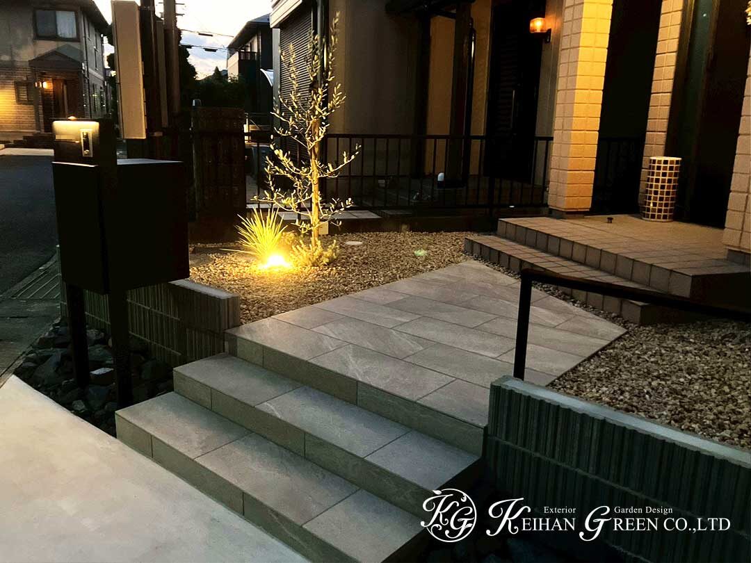 素材を厳選し、段差や動線をていねいに組み直すことで、昼は明るく開放的に、夜は光でやさしく迎える玄関まわりが整いました。