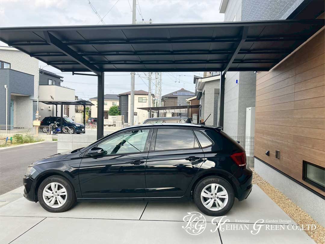 黒い柱・梁で統一したカーポートはサッシ色と好相性。