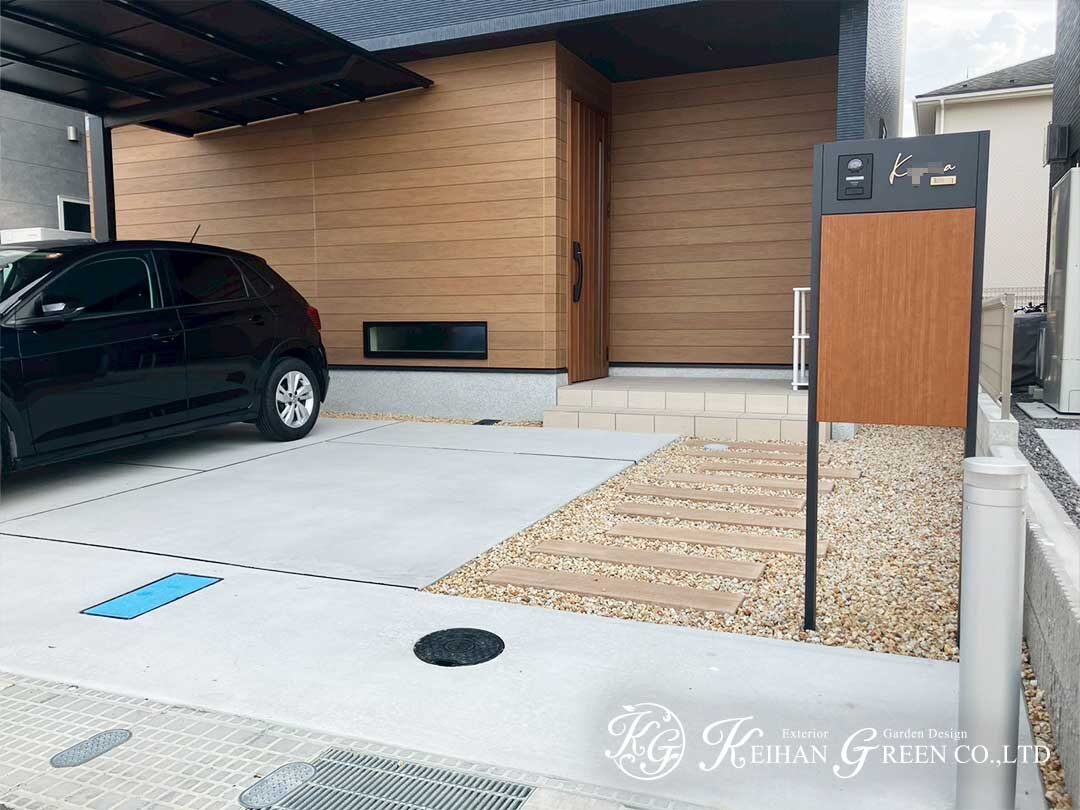 主役はブラックフレームのカーポートと、化粧砂利の上にコンクリート擬木(枕木風)を並べたアプローチ。