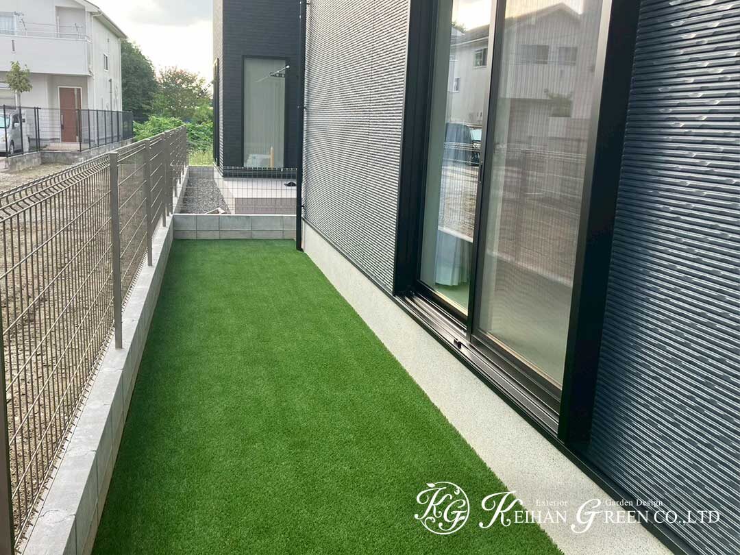 側庭は人工芝とし、泥はねを減らしながら一年中きれいな緑を楽しめる仕様に。