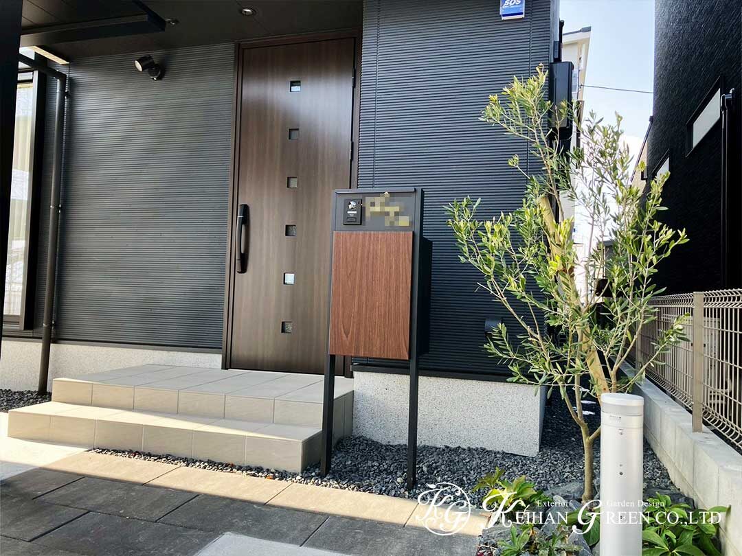 玄関前はポストと植栽でほどよくやわらかさを添え、住まい全体が引き締まって見えるようバランスを整えています。