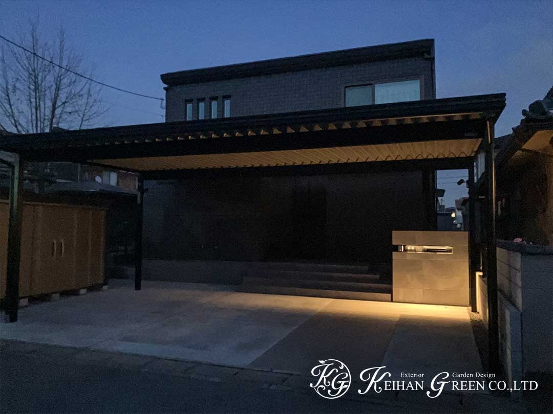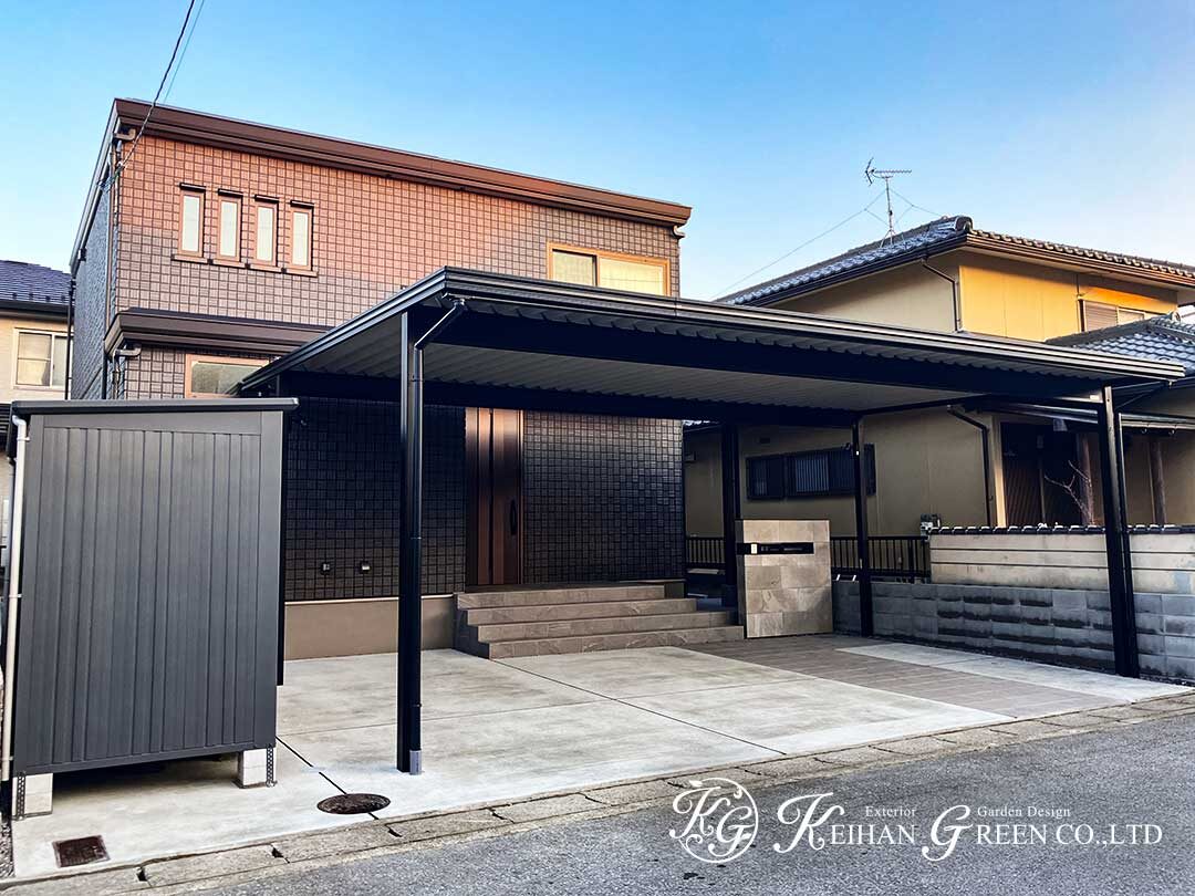重厚感のある折板屋根のカーポートを中心に、シンプルながらも機能性をしっかり確保した外構プランです。