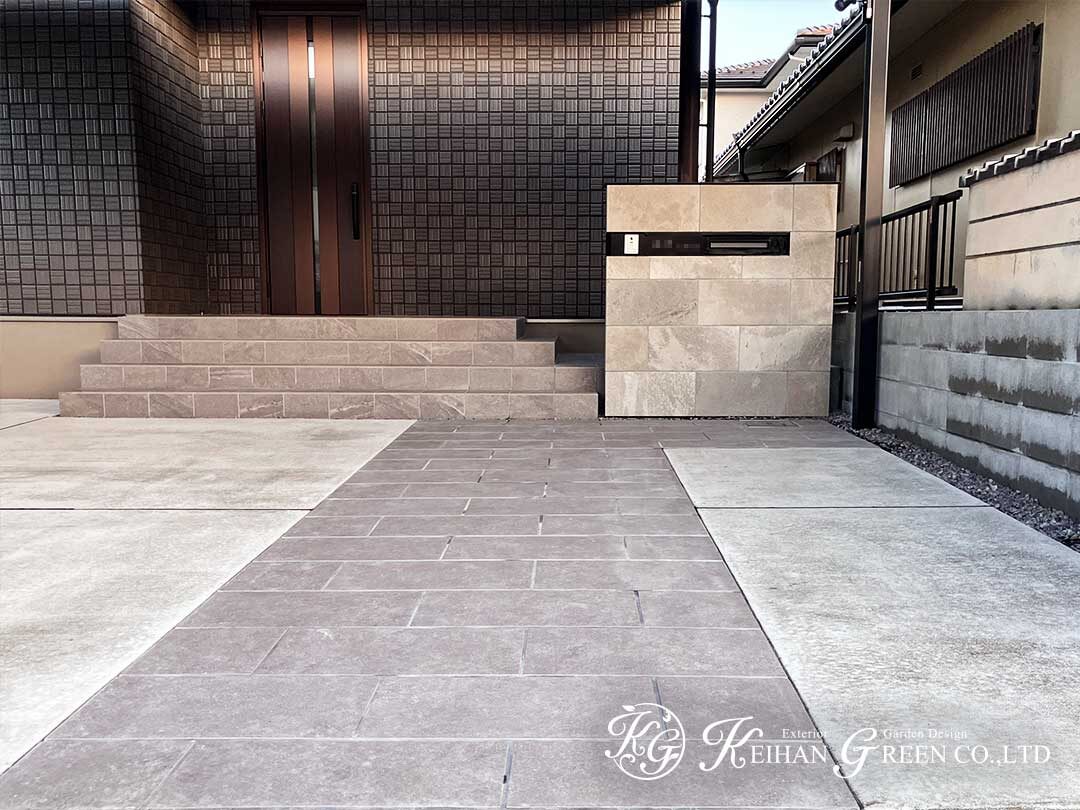 アプローチと素材感を揃えることで、外構全体に統一感を持たせています。