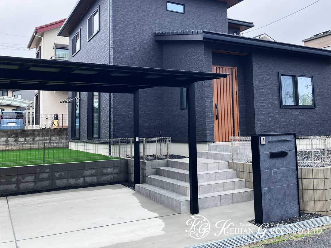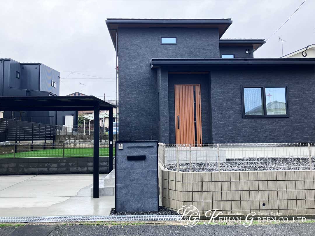 ダークトーンの建物に合わせ、外構全体もブラックとグレーで統一した新築外構。