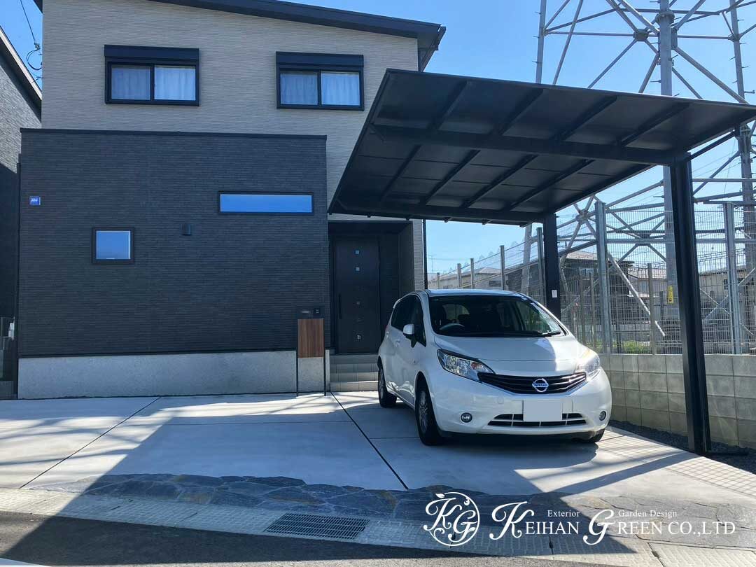 モノトーンでまとめられた建物の外観に合わせて、外構もすっきりとした印象で整えた新築外構です。