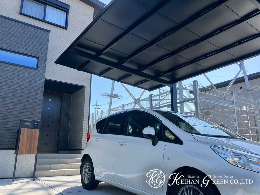 カーポートにはブラックポリカの屋根を採用。