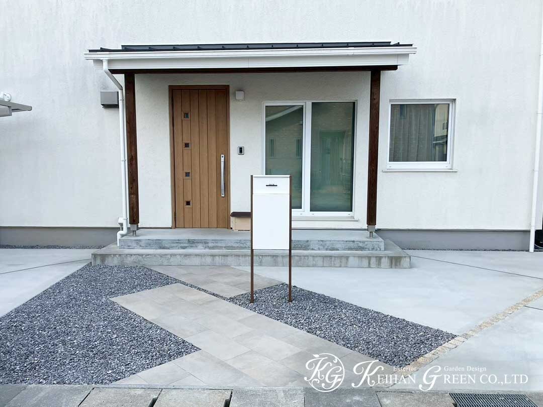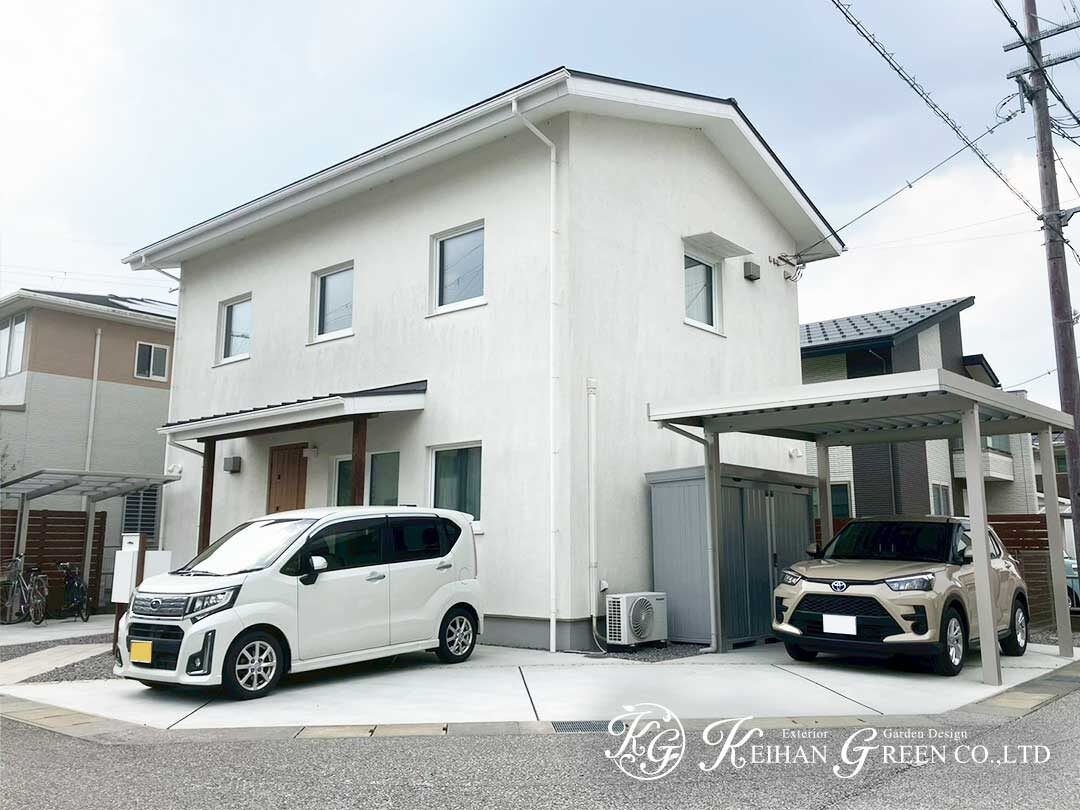 白い外観のお住まいに合わせて、全体をすっきりとまとめた新築外構。