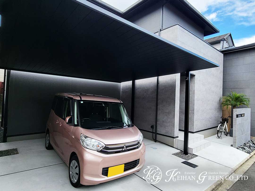 フラット屋根のカーポート(三協アルミ「FⅡ」)と、大判タイルで仕上げた門柱、そして要素を水平にそろえた機能面のレイアウト。