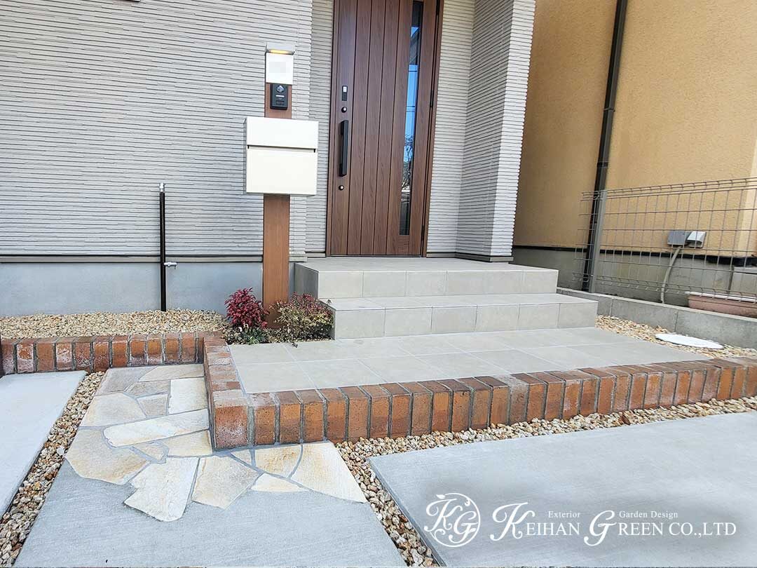 既存ポーチに合わせたタイルを使用し、縁にはレンガをあしらうことで、違和感なく一体感のある仕上がりになっています。