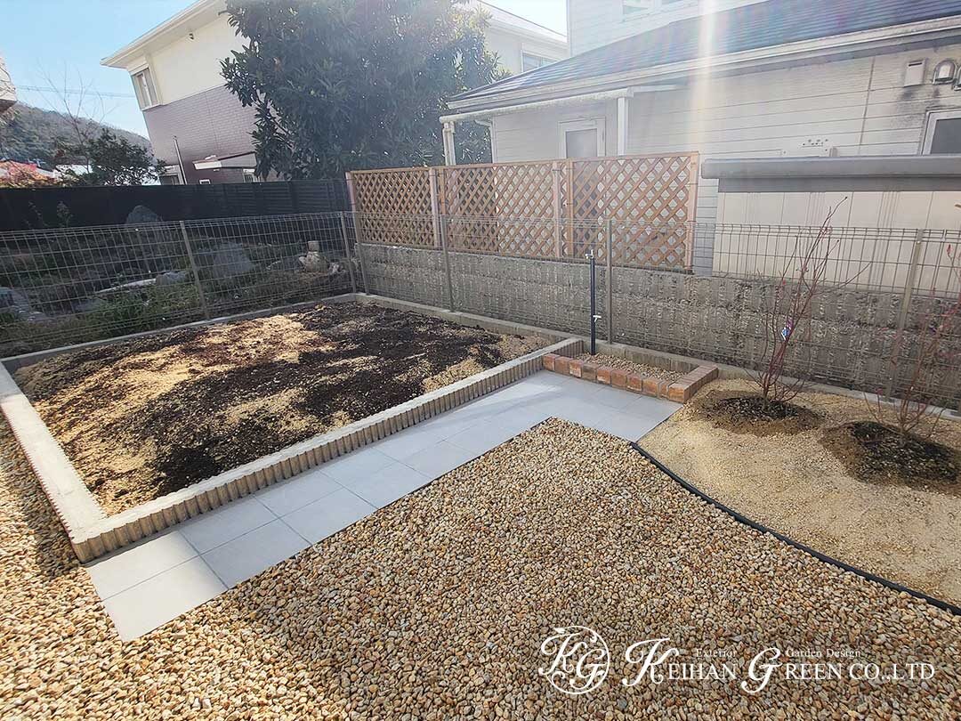 砂利や土のスペースとのバランスを取りながら、管理のしやすい庭に仕上げています。
