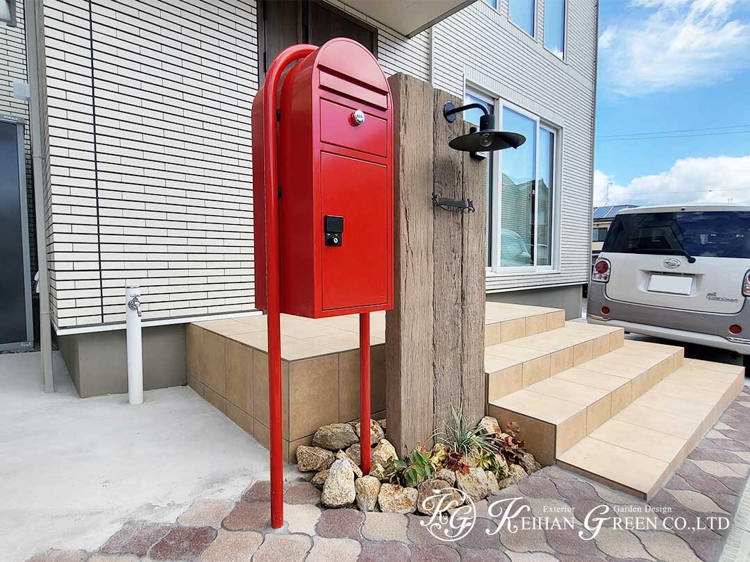 門柱の横には鮮やかな赤い宅配ポストを設置しました。