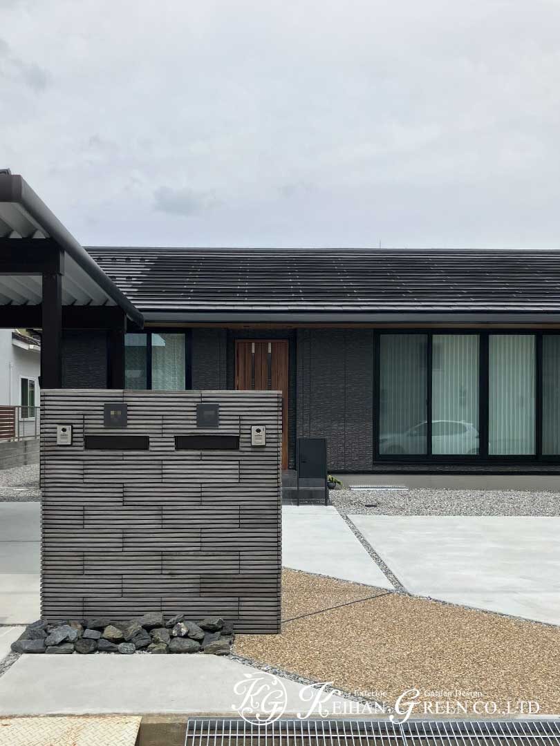 落ち着いた色合いの平屋に合わせて計画された、シンプルで整いのある新築外構。