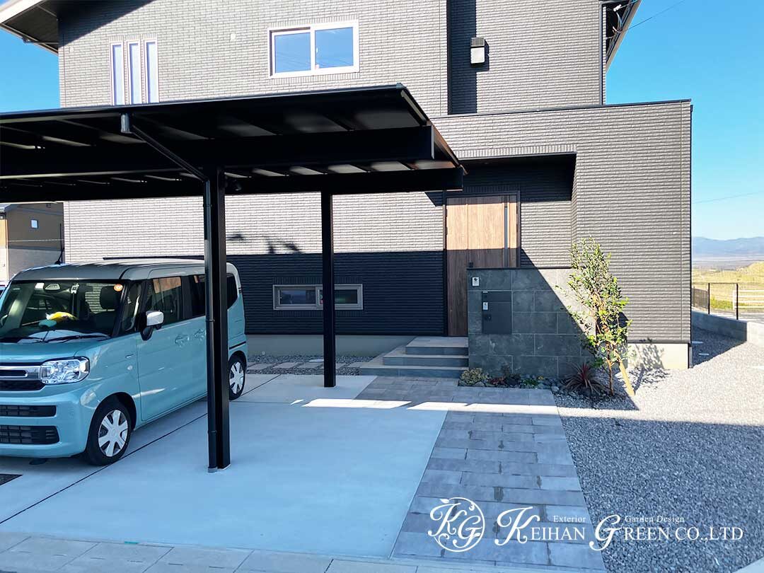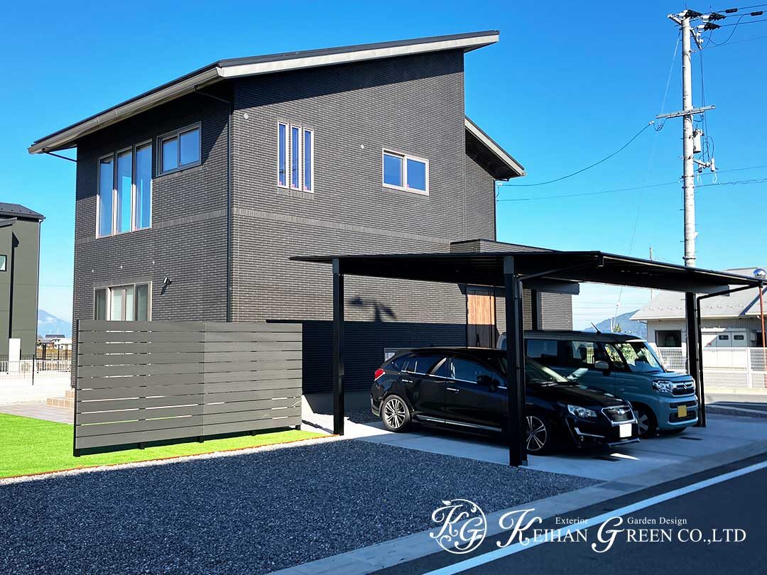 フラット屋根のカーポートはブラックで統一し、建物と一体感のある落ち着いた印象に。