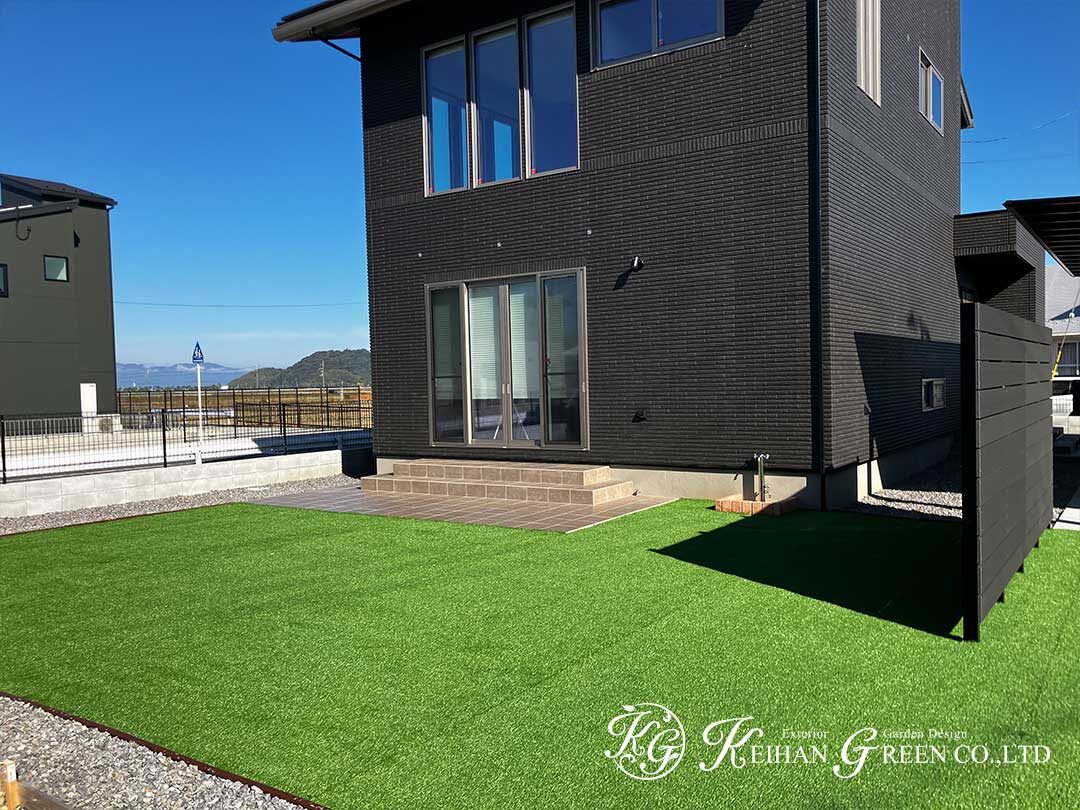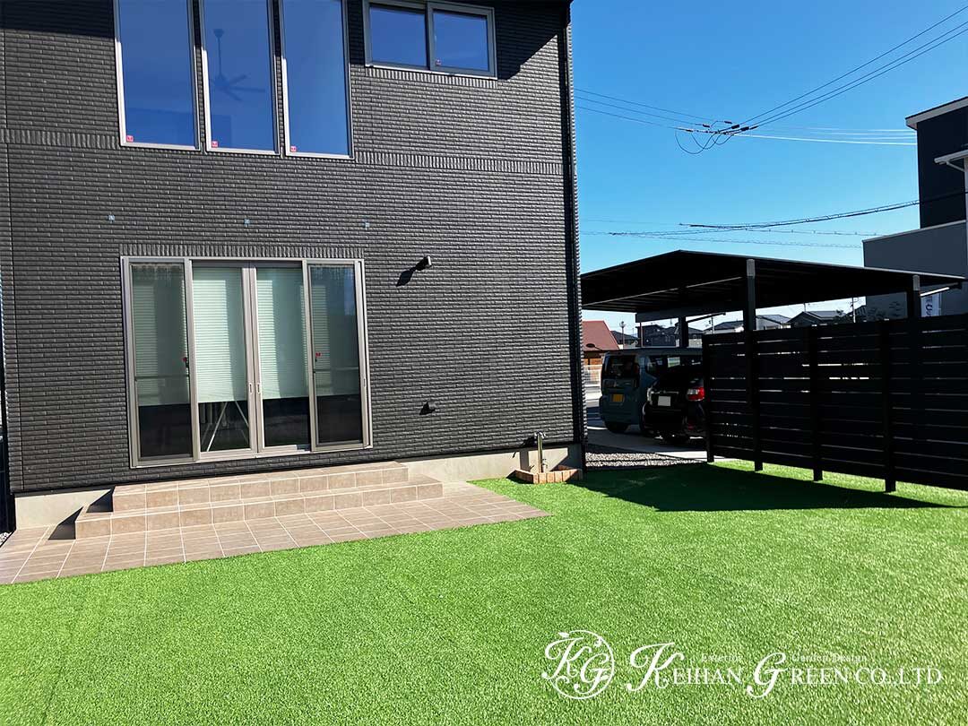 そのまわりを青々とした人工芝で囲むことで、見た目は本物の芝生のように爽やかでありながら、雑草取りや芝刈りの負担をぐっと軽くしています。