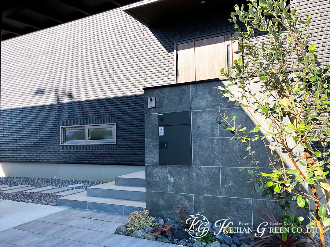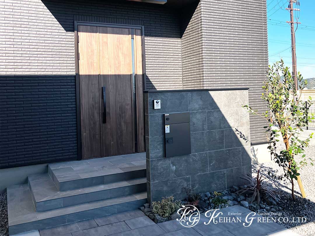 門柱まわりはダークグレーのタイルでまとめ、背景に見える木目調の玄関ドアがほどよいアクセントになっています。