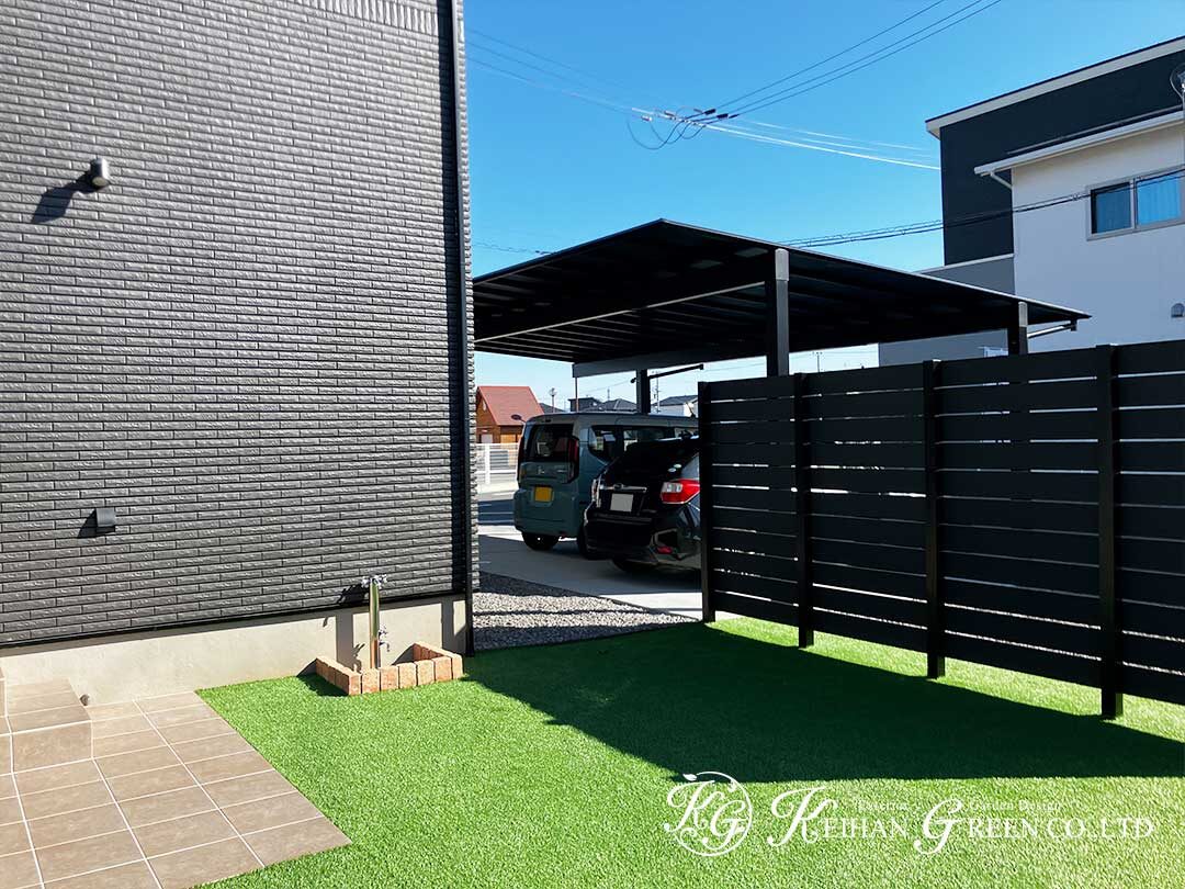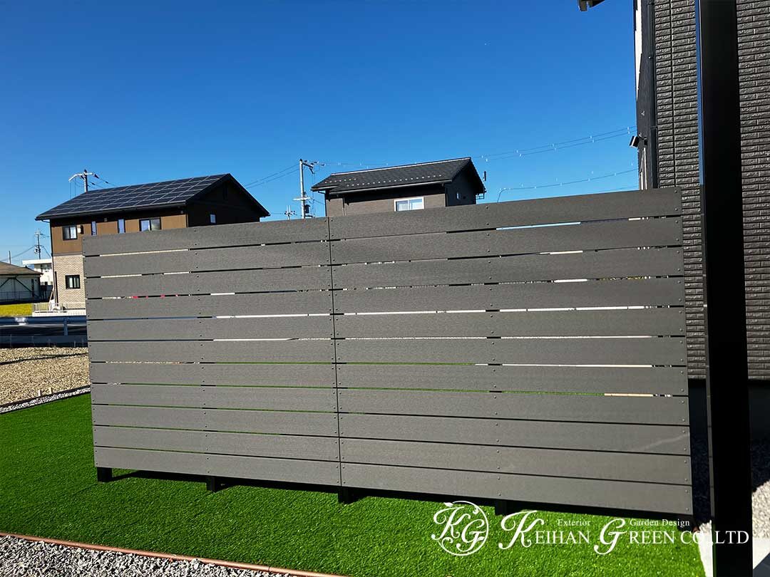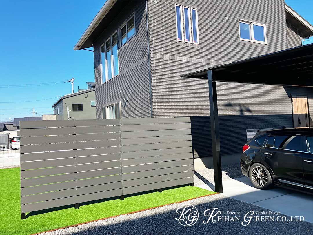 道路側にはシックなグレーの横板貼り目隠しフェンスを配置し、ブラックの外壁とトーンを合わせて落ち着いた雰囲気に。