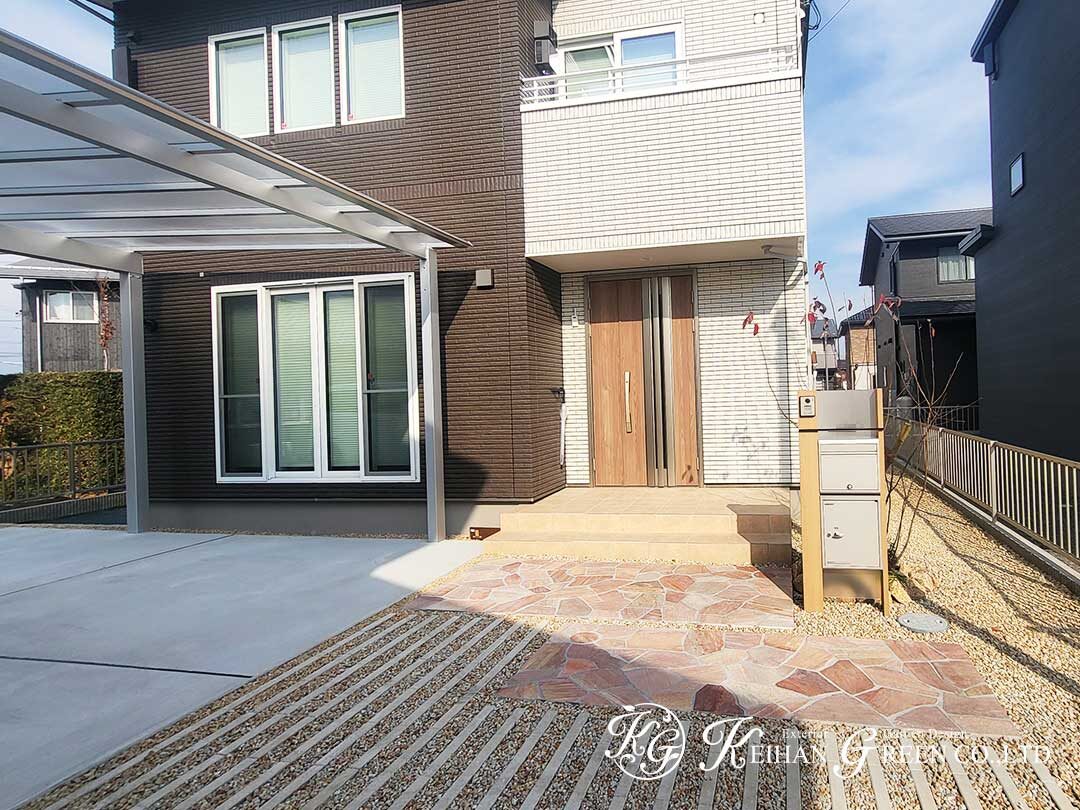 足元は割栗石を使ったロックガーデンでまとめ、メンテナンス性を確保しながら、玄関まわりの“見どころ”になるよう仕上げました。