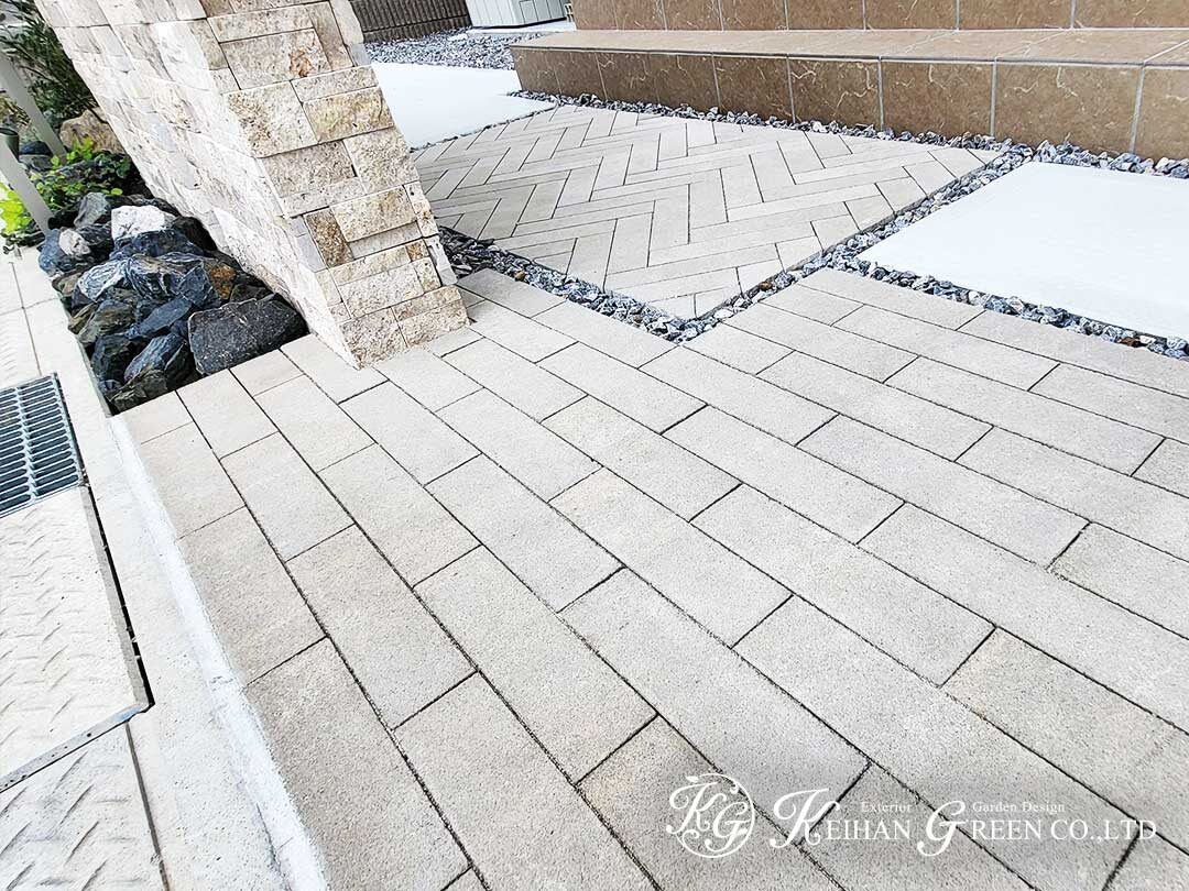 門袖まわりの石の質感と響き合い、明るく清潔感のあるアプローチを演出します。