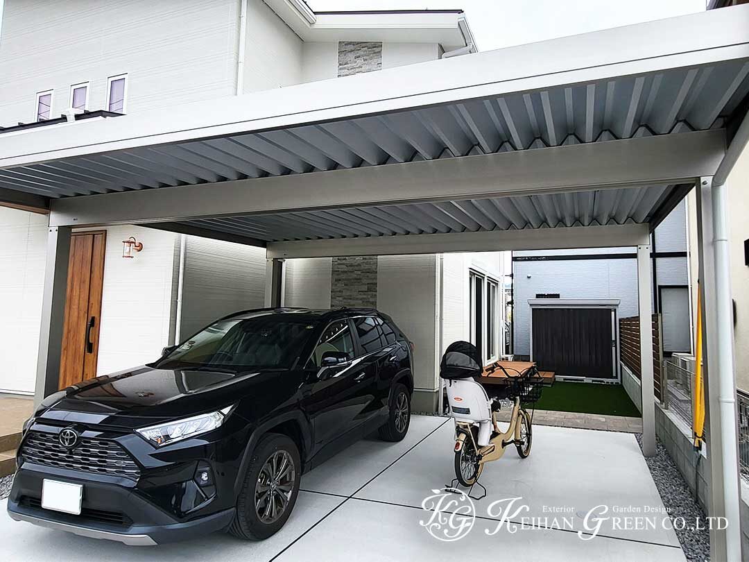 駐車スペースは間口いっぱいに確保し、屋根付きで車の乗り降りが快適。