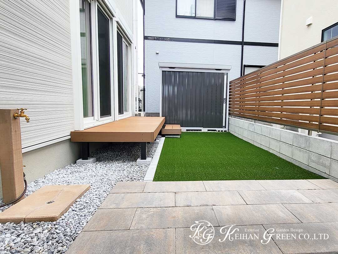 人工芝のスペースは一年中グリーンを保てるので、子どもの遊び場やレジャーの準備にも最適。