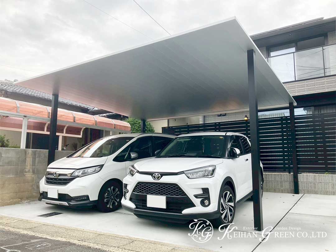 2台分のカーポートは、屋根をサンシルバー、柱をブラックとしたツートンカラーで統一。